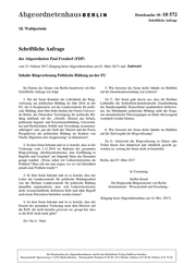 "content": "Drucksache 18 / 10 572 Schriftliche Anfrage 18. Wahlperiode Schriftliche Anfrage des Abgeordneten Paul Fresdorf (FDP) vom 23. Februar 2017 (Eingang beim Abgeordnetenhaus am 01. März 2017) und Antwort Inhalte Ringvorlesung Politische Bildung an der FU Im Namen des Senats von Berlin beantworte ich Ihre 5. Wie bewertet der Senat derlei Inhalte im Hinblick Schriftliche Anfrage wie folgt: auf die Demokratieerziehung von Lehrern? 1. Hat der Senat Kenntnis der Lehrinhalte der Ring- Zu 5.: Der Senat geht davon aus, dass die Berliner vorlesung zur politischen Bildung im Jahr 2016 an der Lehrkräfte die freiheitlich-demokratische Grundordnung FU, die in Kooperation von der Landeszentrale für politi- der Bundesrepublik Deutschland ausdrücklich befürwor- sche Bildung, dem Otto-Suhr-Institut der Freien Universi- ten. Im Mittelpunkt politischer Bildung steht die Frage, tät Berlin, der Deutschen Vereinigung für politische Bil- wie demokratische Überzeugungen an Dritte überzeugend dung stattfand, mit der „Absicht, Akteure aus Schule, vermittelt werden können. politischer Jugend- und Erwachsenenbildung, Universitä- ten und Hochschulen, Politik und Verwaltung zusammen- zubringen“ und „aus der Sicht der Theorie und der Praxis 6. Wie bewertet der Senat derlei Inhalte im Hinblick Perspektiven der politischen Bildung im Kontext von auf die Zielvorgabe der Ringvorlesung? Flucht, Migration und Ausgrenzung“ zu diskutieren? Zu 6.: Inwieweit die Ringvorlesung in Gänze oder 2. Ist dem Senat bekannt und ist es korrekt, dass in der Teilen ihrem Ziel didaktisch und inhaltlich gerecht ge- Vorlesung vom 1.11.2016 im Rahmen der genannten worden ist, vermag der Senat nicht zu beurteilen. Ringvorlesung „Rechtsextremismus, eine Einführung in Begriffe und Ursachen“ am folgende Sätze des Dozenten gesagt wurden: „Wieso sehen wir Linksextremismus als Berlin, den 07. März 2017 Problem? Man soll mir mal zeigen, wo zu viel Gleichheit jemals zum Problem wurde“? In Vertretung 3. Ist dem Senat bekannt und ist es korrekt, dass der Leiter der Landeszentrale für politische Bildungsarbeit Steffen Krach von der Berliner Landeszentrale für politische Bildung Der Regierende Bürgermeister von Berlin daraufhin argumentierte, dass sich Linksextremismus Senatskanzlei - Wissenschaft und Forschung - nicht wissenschaftliche definieren ließe und ohne Begriff auch keine Prävention betrieben werden könne? (Eingang beim Abgeordnetenhaus am 14. Mrz. 2017) 4. Ist dem Senat bekannt und ist es korrekt, dass der Dozent der genannten Vorlesung nach dem Hinweis auf die RAF, die nicht harmlos gewesen sei, gesagt hat, dass es die RAF nicht mehr gebe? Zu 1 bis 4.: Nein. Die Drucksachen des Abgeordnetenhauses sind bei der Kulturbuch-Verlag GmbH zu beziehen. Hausanschrift: Sprosserweg 3, 12351 Berlin-Buckow · Postanschrift: Postfach 47 04 49, 12313 Berlin, Telefon: 6 61 84 84; Telefax: 6 61 78 28.",
