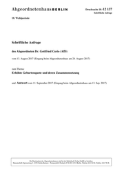 "content": "Drucksache 18 / 12 137 Schriftliche Anfrage 18. Wahlperiode Schriftliche Anfrage des Abgeordneten Dr. Gottfried Curio (AfD) vom 13. August 2017 (Eingang beim Abgeordnetenhaus am 24. August 2017) zum Thema: Erhöhte Geburtenquote und deren Zusammensetzung und Antwort vom 11. September 2017 (Eingang beim Abgeordnetenhaus am 13. Sep. 2017) Die Drucksachen des Abgeordnetenhauses sind bei der Kulturbuch-Verlag GmbH zu beziehen. Hausanschrift: Sprosserweg 3, 12351 Berlin-Buckow · Postanschrift: Postfach 47 04 49, 12313 Berlin, Telefon: 6 61 84 84; Telefax: 6 61 78 28.",
