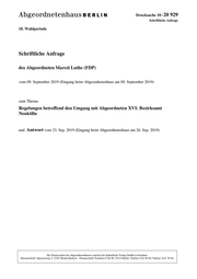 "content": "Drucksache 18 / 20 929 Schriftliche Anfrage 18. Wahlperiode Schriftliche Anfrage des Abgeordneten Marcel Luthe (FDP) vom 09. September 2019 (Eingang beim Abgeordnetenhaus am 09. September 2019) zum Thema: Regelungen betreffend den Umgang mit Abgeordneten XVI: Bezirksamt Neukölln und Antwort vom 23. Sep. 2019 (Eingang beim Abgeordnetenhaus am 26. Sep. 2019) Die Drucksachen des Abgeordnetenhauses sind bei der Kulturbuch-Verlag GmbH zu beziehen. Hausanschrift: Sprosserweg 3, 12351 Berlin-Buckow · Postanschrift: Postfach 47 04 49, 12313 Berlin, Telefon: 6 61 84 84; Telefax: 6 61 78 28.",