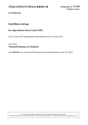 "content": "Drucksache 18 / 17 519 Schriftliche Anfrage 18. Wahlperiode Schriftliche Anfrage des Abgeordneten Marcel Luthe (FDP) vom 15. Januar 2019 (Eingang beim Abgeordnetenhaus am 16. Januar 2019) zum Thema: Videoaufzeichnung von Straftaten und Antwort vom 28. Januar 2019 (Eingang beim Abgeordnetenhaus am 04. Feb. 2019) Die Drucksachen des Abgeordnetenhauses sind bei der Kulturbuch-Verlag GmbH zu beziehen. Hausanschrift: Sprosserweg 3, 12351 Berlin-Buckow · Postanschrift: Postfach 47 04 49, 12313 Berlin, Telefon: 6 61 84 84; Telefax: 6 61 78 28.",