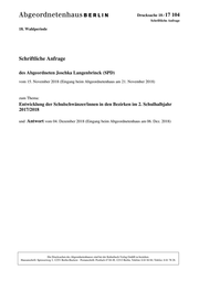 "content": "Drucksache 18 / 17 104 Schriftliche Anfrage 18. Wahlperiode Schriftliche Anfrage des Abgeordneten Joschka Langenbrinck (SPD) vom 15. November 2018 (Eingang beim Abgeordnetenhaus am 21. November 2018) zum Thema: Entwicklung der Schulschwänzer/innen in den Bezirken im 2. Schulhalbjahr 2017/2018 und Antwort vom 04. Dezember 2018 (Eingang beim Abgeordnetenhaus am 06. Dez. 2018) Die Drucksachen des Abgeordnetenhauses sind bei der Kulturbuch-Verlag GmbH zu beziehen. Hausanschrift: Sprosserweg 3, 12351 Berlin-Buckow · Postanschrift: Postfach 47 04 49, 12313 Berlin, Telefon: 6 61 84 84; Telefax: 6 61 78 28.",