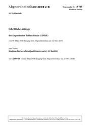 "content": "Drucksache 18 / 13 745 Schriftliche Anfrage 18. Wahlperiode Schriftliche Anfrage des Abgeordneten Tobias Schulze (LINKE) vom 09. März 2018 (Eingang beim Abgeordnetenhaus am 12. März 2018) zum Thema: Studium für beruflich Qualifizierte nach § 11 BerlHG und Antwort vom 22. März 2018 (Eingang beim Abgeordnetenhaus am 27. Mrz. 2018) Die Drucksachen des Abgeordnetenhauses sind bei der Kulturbuch-Verlag GmbH zu beziehen. Hausanschrift: Sprosserweg 3, 12351 Berlin-Buckow · Postanschrift: Postfach 47 04 49, 12313 Berlin, Telefon: 6 61 84 84; Telefax: 6 61 78 28.",