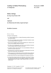 "content": "Landtag von Baden-Württemberg Drucksache 15 / 4525 15. Wahlperiode 18. 12. 2013 Kleine Anfrage des Abg. Georg Wacker CDU und Antwort des Ministeriums für Kultus, Jugend und Sport Berufliche Gymnasien Kleine Anfrage Ich frage die Landesregierung: 1. An welchen Standorten gibt es in Baden-Württemberg berufliche Gymnasien mit welchen Profilen? 2. Wie viele neue Standorte und neue Profile an bestehenden Standorten wurden seit dem Schuljahr 2006/2007 eingerichtet? 3. Wie hat sich die Zügigkeit an den einzelnen Standorten bzw. landesweit nach Profil seit dem Schuljahr 2006/2007 entwickelt? 4. Wie haben sich die Schülerzahlen nach Profil an den beruflichen Gymnasien seit dem Schuljahr 2006/2007 landesweit entwickelt? 5. In welchem Umfang wurden Bewerber in den unterschiedlichen Profilen der beruflichen Gymnasien abgewiesen? 6. Wie prognostiziert sie generell die Entwicklung der Schülerzahlen bis zum Jahr 2020 in den einzelnen Stadt- und Landkreisen? 7. Welche prognostizierten Schülerzahlen und durchschnittliche Klassengröße legt sie den Bedarfsplanungen für die beruflichen Gymnasien bis 2020 zugrunde? 8. Welche Folge hat dies für die Zahl und Zügigkeit der beruflichen Gymnasien? 9. In welchen Raumschaften bestehen noch sogenannte „weiße Flecken“, in denen für Schülerinnen und Schüler noch kein adäquater Übergang an ein berufliches Gymnasium besteht (unter Angabe, ob ggf. bestimmte Profile vor Ort nicht er- reichbar sind)? Eingegangen: 18. 12. 2013 / Ausgegeben: 21. 01. 2014 1 Drucksachen und Plenarprotokolle sind im Internet Der Landtag druckt auf Recyclingpapier, ausgezeich- abrufbar unter: www.landtag-bw.de/Dokumente net mit dem Umweltzeichen „Der Blaue Engel“.",