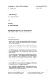 "content": "Landtag von Baden-Württemberg Drucksache 15 / 6596 15. Wahlperiode 10. 03. 2015 Große Anfrage der Fraktion der CDU und Antwort der Landesregierung Maßnahmen zur Prävention und Deradikalisierung im Bereich des religiös motivierten Extremismus Große Anfrage Wir fragen die Landesregierung: 1. \u0007Inwieweit setzt sie ein ressort- und phänomenübergreifendes Konzept zur Prä- vention im Bereich des religiös motivierten Extremismus und zur Deradikalisie- rung betroffener Personen um? 2. \u0007In welcher Höhe sind Haushaltsmittel in den jeweiligen Einzelplänen des Dop- pelhaushalts 2015/16 für Maßnahmen zur Prävention im Bereich des religiös motivierten Extremismus eingestellt (mit Angabe der jeweiligen Kapitel und Titel)? 3. \u0007In welcher Höhe stehen Haushaltsmittel für Aussteigerprogramme und Maßnah- men zur Deradikalisierung und Reintegration von religiös motivierten Extre- misten im Staatshaushaltsplan 2015 zur Verfügung (mit Angabe der jeweiligen Kapitel und Titel)? 4. \u0007Wie viele Personalstellen stehen im Ministerium für Integration, im Innenminis- terium, im Ministerium für Kultus, Jugend und Sport sowie gegebenenfalls in anderen Fachministerien für den Aufgabenbereich Prävention und Deradikali- sierung im Bereich des religiös motivierten Extremismus jeweils zur Verfügung? 5. \u0007Erachtet sie die Bündelung der Expertise der verschiedenen Ministerien in ei- nem zentralen Kompetenzzentrum für Extremismus für sinnvoll, welches als Koordinierungs- und Anlaufstelle dienen könnte? 6. \u0007Auf welche Weise findet eine interministerielle Abstimmung oder Kooperation bei den verschiedenen präventiven und repressiven Maßnahmen gegen religiös motivierten Extremismus in Baden-Württemberg statt? 7. \u0007Welche Maßnahmen hat sie bislang ergriffen, um als religiös motivierte Ex- tremisten identifizierte Personen zum Ausstieg zu bewegen und mit welchem Erfolg wurden solche Maßnahmen durchgeführt? Eingegangen: 10. 03. 2015 / Ausgegeben: 20. 05. 2015 1 Drucksachen und Plenarprotokolle sind im Internet Der Landtag druckt auf Recyclingpapier, ausgezeich- abrufbar unter: www.landtag-bw.de/Dokumente net mit dem Umweltzeichen „Der Blaue Engel“.",