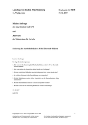 "content": "Landtag von Baden-Württemberg Drucksache 16 / 3178 16. Wahlperiode 19. 12. 2017 Kleine Anfrage des Abg. Reinhold Gall SPD und Antwort des Ministeriums für Verkehr Sanierung der Autobahnbrücke A 81 bei Eberstadt-Hölzern Kleine Anfrage Ich frage die Landesregierung: 1. Seit wann ist die Sanierung der Eberbachtalbrücke an der A 81 bei Eberstadt- Hölzern geplant? 2. Seit wann stehen die finanziellen Mittel hierfür zur Verfügung? 3. Warum wurde diese Maßnahme noch nicht begonnen bzw. warum stockt diese? 4. In welchem Zeitraum ist die Durchführung nun vorgesehen? 5. Welche Maßnahmen wurden bisher eingeleitet, um die Baumaßnahmen zügig umzusetzen? 6. Welche Baumaßnahmen müssen konkret durchgeführt werden? 7. Welche Kosten für die Sanierung der Brücke werden veranschlagt? 19. 12. 2017 Gall SPD Eingegangen: 19. 12. 2017 / Ausgegeben: 07. 02. 2018 1 Drucksachen und Plenarprotokolle sind im Internet Der Landtag druckt auf Recyclingpapier, ausgezeich- abrufbar unter: www.landtag-bw.de/Dokumente net mit dem Umweltzeichen „Der Blaue Engel“.",