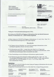 "content": "= DERLANDRAT FR DES LANDKREISES DARMSTADT-DIEBURG EEE? Ea® azEs Regio\"kunft BERmM Landkreis De adeD -.Veterinäramt - DerLandrat desLandkreises Darmstadt-Dieburg, 64276Darmstadt Außenstelle Rheinstraße 67,64295Darmstadt (ns) mitZustellungsurkunde IHRE \"_ ███ \\{1s) ██████ ██████████████████████ ████ ██████████████ E-Mail: veterinaeramt@ladadi.de Internet: http://www.ladadi.de/ Zentrale:06151 /95161-0 IhrZeichen/Schreiben vom Mein Zeichen Datum 420.5- 20206/03a-148/19 (VIG) 13.07.2019 VollzugdesVerbraucherinformationsgesetzes (VIG); IhrAntragvom 10.06.2019 aufZugang zu Informationen überden BetriebRestaurant Mykonos, FrankensteinerStr.1,64342 Seeheim-Jugenheim aufIhren Antrag vom 10.06.2019 aufZugangzuInformationen i. S.von$2 Abs.1SatzINr. 1. desVerbraucherinformationsgesetzes (VIG)ergeht folgender Bescheid: 1.DerZugangzu denmitSchreiben vom 10.06.2019 beantragten Informationen zu dem nachfolgend aufgeführten Betrieb wirdIhneneröffnet. 2.DieInformationen nach Ziffer 1.werdenIhnennachAblaufvon 14Tagennach Zustellung dieses Bescheides mittels Übersendung von KopienderKontrollberichte, welche hinsichtlich personenbezogener Datenanonymisiert sind, erteilt. 3.DieseEntscheidung sowiedieErteilung derInformationen ergehenkostenfrei. 4.Der Widerspruch gegendiesenBescheid entfaltet gemäß $ 80 Abs.2 Satz1Nr.3 der Verwaltungsgerichtsordnung (VwGO) vom 19.03.1991 (BGBl.IS.686),zuletzt geändert durchGesetzvom 12.07.2018 (BGBl.IS. 1151)i.V.m. $ 5 Abs.4 Satz1VIG keineaufschiebende Wirkung. Begründung: MitSchreiben vom 10.06.2019 habenSieeinen Antrag aufZugangzuInformationen überdenunter Ziffer 1.genannten Betrieb gestellt. Bezüglich derFormulierung wirdinsoweit aufdenInhalt Ihres Antrages Bezug genommen. Postanschrift: DerLandrat des Landkreises Darmstadt-Dieburg 64276Darmstadt Dienstgebäude/Hausadresse: Stadt- u.Kreissparkasse Darmstadt Rheinstraße 67 BICHELADEFIDAS 64295Darmstadt IBAN DE47 50850150 0000 549096 Sparkasse Dieburg BIC HELADEFIDIE IBAN DE21 508526510033200114 Fristenbriefkasten: Jägertorstraße 207 64289Darmstadt Telefonische Erreichbarkeit: Mo. - Do.8:00 bis14.30Uhr Fr. 8:00bis12.30 Uhr Postbank Frankfurt/Main BIC PBNKDEFF IBAN DES50500100600011544609 Termine nur nach vorherigerVereinbarung Ust-IdNr. DE 111608693",