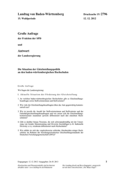 "content": "Landtag von Baden-Württemberg Drucksache 15 / 2796 15. Wahlperiode 12. 12. 2012 Große Anfrage der Fraktion der SPD und Antwort der Landesregierung Die Situation der Gleichstellungspolitik an den baden-württembergischen Hochschulen Große Anfrage Wir fragen die Landesregierung: I. Aktuelle Situation der Förderung der Gleichstellung 1. An welchen baden-württembergischen Hochschulen gibt es Gleichstellungs- beauftragte sowie Stellvertreterinnen und Stellvertreter? 2. Wie viele der Gleichstellungsbeauftragten üben das Amt gegenwärtig kommis- sarisch aus? 3. Wie ist jeweils die Anzahl der Stellvertreterinnen und Stellvertreter und der Fakultätsgleichstellungsbeauftragten und wie setzen sich die Gleichstellungs- kommissionen zusammen (jeweils differenziert nach den einzelnen Hoch- schulen)? 4. Gibt es darüber hinaus Personen, die sich schwerpunktmäßig mit der Umset- zung von Gender Mainstreaming und Diversity beschäftigen (z. B. Stabsstelle Diversity o. ä.), wiederum differenziert nach Hochschulen? 5. Wie erklärt sie sich das vergleichsweise schlechte Abschneiden einiger Hoch- schulen im Rahmen der forschungsorientierten Gleichstellungsstandards der Deutschen Forschungsgemeinschaft (DFG)? Eingegangen: 12. 12. 2012 / Ausgegeben: 26. 03. 2013 1 Drucksachen und Plenarprotokolle sind im Internet Der Landtag druckt auf Recyclingpapier, ausgezeich- abrufbar unter: www.landtag-bw.de/Dokumente net mit dem Umweltzeichen „Der Blaue Engel“.",