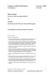 "content": "Landtag von Baden-Württemberg Drucksache 16 / 8663 16. Wahlperiode 17. 08. 2020 Kleine Anfrage des Abg. Dr. Hans-Ulrich Rülke FDP/DVP und Antwort des Ministeriums für Wirtschaft, Arbeit und Wohnungsbau Wirtschaftliche Entwicklung im Stadtkreis Pforzheim Kleine Anfrage Ich frage die Landesregierung: 1. Wie viele Gewerbeanmeldungen, -abmeldungen und -insolvenzen gab es seit 2006 im Stadtkreis Pforzheim (pro Jahr, aufgeschlüsselt nach Branchen)? 2. Wie haben sich einschlägige volkswirtschaftliche Daten im Stadtkreis Pforz- heim seit 2006 bis heute entwickelt (Umsatz, Arbeitslosenzahlen, Erwerbstäti- genzahl, Bruttoinlandsprodukt, Exportquote, Investitionsquote, Forschungs- und Entwicklungsausgaben, Gewerbesteuerzahlungen, Steuerquote usw.)? 3. Wie bewertet sie die wirtschaftliche Entwicklung im Stadtkreis Pforzheim im landesweiten Vergleich? 4. Wie hat sich die Zahl von Anfängern und Absolventen einer betrieblichen Aus- bildung, eines dualen Studiums unter Beteiligung eines Betriebs im Stadtkreis Pforzheim sowie eines Studiums an der Hochschule Pforzheim seit 2006 bis heute entwickelt (aufgeteilt nach Branchen bzw. Fachrichtungen)? 5. Wie viele Ausbildungsplätze bleiben aktuell im Stadtkreis Pforzheim unbe- setzt? 6. Mit welchen Mitteln aus dem originären Landeshaushalt hat sie die wirtschaft- liche Entwicklung im Stadtkreis Pforzheim seit 2006 bis heute gefördert? 7. Mit welchen Mitteln aus dem originären Landeshaushalt fördert sie die beruf- lichen Schulen im Stadtkreis Pforzheim sowie die Hochschule Pforzheim (ge- gliedert in einmalige Unterstützungsmaßnahmen, laufende Zuschüsse usw.)? 8. Wie haben sich die Anträge auf Kurzarbeitergeld von 2006 bis heute ent- wickelt? Eingegangen: 17. 08. 2020 / Ausgegeben: 16. 10. 2020 1 Drucksachen und Plenarprotokolle sind im Internet Der Landtag druckt auf Recyclingpapier, ausgezeich- abrufbar unter: www.landtag-bw.de/Dokumente net mit dem Umweltzeichen „Der Blaue Engel“.",