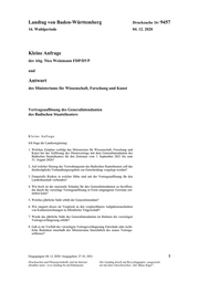 "content": "Landtag von Baden-Württemberg Drucksache 16 / 9457 16. Wahlperiode 04. 12. 2020 Kleine Anfrage des Abg. Nico Weinmann FDP/DVP und Antwort des Ministeriums für Wissenschaft, Forschung und Kunst Vertragsauflösung des Generalintendanten des Badischen Staatstheaters Kleine Anfrage Ich frage die Landesregierung: 1. Welchen Zeitplan verfolgt das Ministerium für Wissenschaft, Forschung und Kunst bei der Auflösung des Dienstvertrags mit dem Generalintendanten des Badischen Staatstheaters für den Zeitraum vom 1. September 2021 bis zum 31. August 2026? 2. Auf welcher Sitzung des Verwaltungsrats des Badischen Staatstheaters soll das diesbezügliche Verhandlungsergebnis zur Entscheidung vorgelegt werden? 3. Finanzielle Risiken in welcher Höhe sind mit der Vertragsauflösung für den Landeshaushalt verbunden? 4. Wie hoch ist der maximale Schaden für den Generalintendanten zu beziffern, der durch die vorzeitige Vertragsauflösung in Form entgangener Gewinne ent- stehen kann? 5. Welches jährliche Salär erhält der Generalintendant? 6. Wie rangiert dieses im Vergleich zu den vergleichbaren Aufgabenzuschnitten von Kultureinrichtungen in öffentlicher Trägerschaft? 7. Wurde das jährliche Salär des Generalintendanten im Rahmen der vorzeitigen Vertragsverlängerung erhöht? 8. Gab es im Vorfeld der vorzeitigen Vertragsverlängerung Einwände oder recht- liche Bedenken innerhalb des Ministeriums hinsichtlich des neuen Vertrags- schlusses? Eingegangen: 04. 12. 2020 / Ausgegeben: 27. 01. 2021 1 Drucksachen und Plenarprotokolle sind im Internet Der Landtag druckt auf Recyclingpapier, ausgezeich- abrufbar unter: www.landtag-bw.de/Dokumente net mit dem Umweltzeichen „Der Blaue Engel“.",
