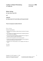 "content": "Landtag von Baden-Württemberg Drucksache 16 / 9086 16. Wahlperiode 20. 10. 2020 Kleine Anfrage des Abg. Stefan Teufel CDU und Antwort des Ministeriums für Umwelt, Klima und Energiewirtschaft Wasserversorgung im Landkreis Rottweil Kleine Anfrage Ich frage die Landesregierung: 1. Wie ist die Wasserversorgung im Landkreis Rottweil zwischen den Versorgern aufgeteilt? 2. Ist es in jüngster Zeit zu Engpässen aufgrund langer Trockenphasen gekommen und wie bewertet sie die Engpässe? 3. Wie stellt sich die Trinkwasserqualität im Landkreis Rottweil im Vergleich zu den anderen Landkreisen in Baden-Württemberg dar? 4. Wie hat sich die Wasserqualität im Laufe der Jahre entwickelt? 5. Wie hoch ist der Anteil der noch nicht an die öffentliche Wasserversorgung an- geschlossenen Bevölkerung im Landkreis Rottweil? 6. Wie haben sich die Trinkwasserpreise in den vergangenen zehn Jahren ent- wickelt? 20. 10. 2020 Teufel CDU Eingegangen: 20. 10. 2020 / Ausgegeben: 11. 12. 2020 1 Drucksachen und Plenarprotokolle sind im Internet Der Landtag druckt auf Recyclingpapier, ausgezeich- abrufbar unter: www.landtag-bw.de/Dokumente net mit dem Umweltzeichen „Der Blaue Engel“.",