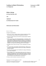 "content": "Landtag von Baden-Württemberg Drucksache 16 / 1022 16. Wahlperiode 29. 11. 2016 Kleine Anfrage des Abg. Emil Sänze AfD und Antwort des Ministeriums für Verkehr Elektroautos und Infrastruktur Kleine Anfrage Ich frage die Landesregierung: 1. Hält sie die in Frage 3 zugrunde gelegten Annahmen bezüglich der Fahrleis- tung, Spannung, Ladung, Ladedauer und Ladekapazität für plausibel? 2. Wenn nein, inwiefern müssen aus ihrer Sicht die zugrunde gelegten Annahmen korrigiert werden? 3. Welche Auswirkungen auf den Gleichzeitigkeitsfaktor von Haushalten schätzt sie bei 200.000, 1.000.000 oder 5.000.000 gleichmäßig auf die Haushalte ver- teilten Elektroautos in Baden-Württemberg ein, wenn man von einer jährlichen Fahrleistung von 15.000 Kilometer, verteilt auf 200 Arbeitstage im Jahr, einer Spannung von 230 Volt, einer Ladung mit 13 Ampere und 3 Kilowatt bei einer Ladedauer von 6 Stunden und einer Ladekapazität von 20 kWh ausgeht? 4. Wie ändert sich die Antwort auf Frage 3 bei einer Ladeleistung von 20 Kilo- watt? 5. Wie viele Einwohner oder Haushalte in Baden-Württemberg verfügen nach ih- rer Kenntnis in absoluten Zahlen über keinen für die Ladung von Elektroautos geeigneten Stellplatz? 6. Wie will sie diesen Einwohnern oder Haushalten die Ladung des Elektroautos auch zu Hause ermöglichen? 7. Hat sie Kenntnis, bei wie vielen Ortsnetzverteilern unter den in Frage 3 ge- schilderten Bedingungen eine Neuberechnung und Anpassung der vorhandenen Sicherungen und Zuleitungen unter den dargestellten Annahmen und einem Gleichzeitigkeitsfaktor von 0,5 oder einem von ihr gemäß Frage 3 als realis- tisch eingeschätzten Gleichzeitigkeitsfaktors notwendig wäre? 8. Wenn ja, welche Investitionen verursachen welche Kosten? Eingegangen: 29. 11. 2016 / Ausgegeben: 12. 01. 2017 1 Drucksachen und Plenarprotokolle sind im Internet Der Landtag druckt auf Recyclingpapier, ausgezeich- abrufbar unter: www.landtag-bw.de/Dokumente net mit dem Umweltzeichen „Der Blaue Engel“.",