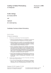 "content": "Landtag von Baden-Württemberg Drucksache 16 / 4581 16. Wahlperiode 09. 08. 2018 Große Anfrage der Fraktion GRÜNE und Antwort der Landesregierung Nachhaltiger Tourismus in Baden-Württemberg Große Anfrage Wir fragen die Landesregierung: I. Bedeutung nachhaltiger Tourismusangebote 1. Welche der bestehenden Definitionen von nachhaltigem Tourismus legt die Landesregierung ihrem Engagement im Tourismus zugrunde? 2. Welche Kenntnisse hat sie (gestützt auf wissenschaftliche Studien und Umfragen) bezüglich des Interesses und der Bereitschaft der Bevölke- rung in Deutschland und den ausländischen Quellmärkten, nachhaltige Tourismusangebote in Baden-Württemberg zu nutzen? 3. Welche wirtschaftliche Bedeutung haben nachhaltige Tourismusange- bote und Naturtourismus, definiert als eine Form des Reisens in natur- nahe Gebiete, bei der das Erleben von Natur im Mittelpunkt steht, für den Tourismusstandort Baden-Württemberg aus Sicht der Landesregie- rung heute und in den kommenden Jahren für das Land, aufgelistet nach Sparte, Anteil an Gästeankünften, Umsatz und Beschäftigungszahlen im Vergleich zu den übrigen touristischen Angeboten? 4. Welche Erfolge und künftigen Entwicklungsperspektiven sieht die Lan- desregierung seit Veröffentlichung der Tourismuskonzeption von 2009 für den Natur-, Wander- und Radtourismus, insbesondere im Länd- lichen Raum? II. Folgen des Klimawandels für den Tourismus und mög- liche Anpassungsstrategien 1. Wie wird sich der Klimawandel nach Einschätzung der Landesregie- rung kurz-, mittel- und langfristig auf den Tourismusstandort Baden- Württemberg und seine Tourismusdestinationen auswirken, z. B. die Eingegangen: 09. 08. 2018 / Ausgegeben: 23. 10. 2018 1 Drucksachen und Plenarprotokolle sind im Internet Der Landtag druckt auf Recyclingpapier, ausgezeich- abrufbar unter: www.landtag-bw.de/Dokumente net mit dem Umweltzeichen „Der Blaue Engel“.",