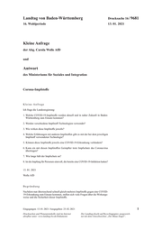 "content": "Landtag von Baden-Württemberg Drucksache 16 / 9681 16. Wahlperiode 13. 01. 2021 Kleine Anfrage der Abg. Carola Wolle AfD und Antwort des Ministeriums für Soziales und Integration Corona-Impfstoffe Kleine Anfrage Ich frage die Landesregierung: 1. \u0007Welche COVID-19-Impfstoffe werden aktuell und in naher Zukunft in Baden- Württemberg zum Einsatz kommen? 2. \u0007Werden verschiedene Impfstoff-Technologien verwendet? 3. \u0007Wie wirken diese Impfstoffe jeweils? 4. \u0007Welche Erfahrungen mit anderen Impfstoffen gibt es mit der bei dem jeweiligen Impfstoff verwendeten Technologie? 5. Können diese Impfstoffe jeweils eine COVID-19-Erkrankung verhindern? 6. \u0007Kann ein mit diesen Impfstoffen Geimpfter trotz Impfschutz das Coronavirus übertragen? 7. Wie lange hält der Impfschutz an? 8. \u0007Ist die Impfung für Personen sinnvoll, die bereits eine COVID-19-Infektion hatten? 13. 01. 2021 Wolle AfD Begründung Nachdem nun überraschend schnell gleich mehrere Impfstoffe gegen eine COVID- 19-Erkrankung zum Einsatz kommen, stellen sich viele Fragen über die Wirkungs- weise und die Sicherheit dieser Impfstoffe. Eingegangen: 13. 01. 2021 / Ausgegeben: 25. 02. 2021 1 Drucksachen und Plenarprotokolle sind im Internet Der Landtag druckt auf Recyclingpapier, ausgezeich- abrufbar unter: www.landtag-bw.de/Dokumente net mit dem Umweltzeichen „Der Blaue Engel“.",