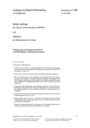 "content": "Landtag von Baden-Württemberg Drucksache 16 / 788 16. Wahlperiode 14. 10. 2016 Kleine Anfrage des Abg. Dr. Erik Schweickert FDP/DVP und Antwort des Ministeriums für Verkehr Vollsperrung der Bundesstraße (B) 10 von Wilferdingen in Richtung Pforzheim Kleine Anfrage Ich frage die Landesregierung: 1. Trifft es zu, dass die B 10 von Mai bis Oktober 2017 im Rahmen des dreispuri- gen Ausbaus von der Ortsausfahrt Wilferdingen bis zur Kreuzung B 10/K 4538 voll gesperrt werden soll? 2. Wenn nicht, in welchem Zeitraum soll die Straßenbaumaßnahme stattfinden? 3. Hat sie Kenntnis davon, dass entlang der Umleitungsstrecken über Königs- bach-Stein und Eisingen, sowie über Bilfingen, Ersingen und Ispringen oder über Nöttingen, Dietenhausen, Ellmendingen und Dietlingen aufgrund der engen Kurvenradien ein Lkw-Begegnungsverkehr teilweise nur schwer oder gar nicht möglich ist? 4. Wurde statt einer Vollsperrung eine halbseitige Sperrung, z. B. mit einer Am- pelschaltung, Behelfsspur oder teilweiser Einbeziehung des parallel verlaufen- den Radwegs geprüft, um die Durchfahrt zumindest in eine Richtung zu er- möglichen? 5. Inwieweit wurde bei der Planung berücksichtigt und einberechnet, dass die B 10 Umleitungsstrecke für die A 8 ist? 6. Wurde geprüft, ob die in Frage 3 genannten Umleitungsstrecken bei hohem Verkehrsaufkommen, Unfall oder Stau auf der A 8 der dann zusätzlichen Ver- kehrsbelastung standhalten? 7. Wurde die Möglichkeit geprüft, die Sanierung im Drei-Schicht-Betrieb durch- zuführen, um die Gesamtdauer der Maßnahme zu verringern? Eingegangen: 14. 10. 2016 / Ausgegeben: 18. 11. 2016 1 Drucksachen und Plenarprotokolle sind im Internet Der Landtag druckt auf Recyclingpapier, ausgezeich- abrufbar unter: www.landtag-bw.de/Dokumente net mit dem Umweltzeichen „Der Blaue Engel“.",