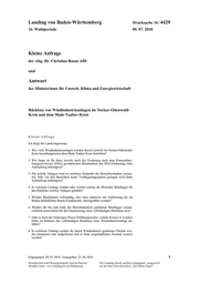 "content": "Landtag von Baden-Württemberg Drucksache 16 / 4429 16. Wahlperiode 09. 07. 2018 Kleine Anfrage der Abg. Dr. Christina Baum AfD und Antwort des Ministeriums für Umwelt, Klima und Energiewirtschaft Rückbau von Windindustrieanlagen im Neckar-Odenwald- Kreis und dem Main-Tauber-Kreis Kleine Anfrage Ich frage die Landesregierung: 1. Wie viele Windindustrieanlagen werden derzeit jeweils im Neckar-Odenwald- Kreis beziehungsweise dem Main-Tauber-Kreis betrieben? 2. Wie lange ist für diese jeweils noch die Förderung nach dem Erneuerbare- Energien-Gesetz (EEG) gewährleistet (Restlaufzeit der EEG-Förderung; bitte Aufstellung anfertigen)? 3. Für welche Anlagen wird zu welchem Zeitpunkt die Betriebserlaubnis auslau- fen, falls von den Betreibern keine Verlängerungsoption gezogen wird (bitte Aufstellung anfertigen)? 4. In welchem Umfang wurden oder werden seitens der Betreiber Rücklagen für den Rückbau welcher Anlagen gebildet? 5. Werden Rückbauten vollständig, also etwa inklusive der Entfernung der im Boden befindlichen Beton-Fundamente, durchgeführt werden? 6. Werden die bis zum Ende der Betriebslaufzeit gebildeten Rücklagen voraus- sichtlich ausreichend für die Finanzierung eines vollständigen Rückbaus sein? 7. Gibt es nach der bisherigen Praxis Erfahrungswerte, welche Kosten in welcher Höhe im Rahmen des vollständigen Rückbaus einer Windindustrieanlage an- fallen? 8. In welchem Umfang werden die durch Windindustrie genutzten Flächen wie- der renaturiert oder aufgeforstet und in ihren ursprünglichen Zustand versetzt werden? Eingegangen: 09. 07. 2018 / Ausgegeben: 21. 08. 2018 1 Drucksachen und Plenarprotokolle sind im Internet Der Landtag druckt auf Recyclingpapier, ausgezeich- abrufbar unter: www.landtag-bw.de/Dokumente net mit dem Umweltzeichen „Der Blaue Engel“.",