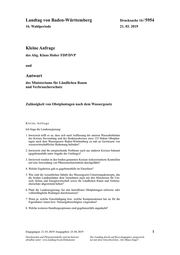 "content": "Landtag von Baden-Württemberg Drucksache 16 / 5954 16. Wahlperiode 21. 03. 2019 Kleine Anfrage des Abg. Klaus Hoher FDP/DVP und Antwort des Ministeriums für Ländlichen Raum und Verbraucherschutz Zulässigkeit von Obstplantagen nach dem Wassergesetz Kleine Anfrage Ich frage die Landesregierung: 1. \u0007Inwieweit trifft es zu, dass sich nach Auffassung der unteren Wasserbehörden des Kreises Ravensburg und des Bodenseekreises etwa 135 Hektar Obstplan- tagen nach dem Wassergesetz Baden-Württemberg zu nah an Gewässern von wasserwirtschaftlicher Bedeutung befinden? 2. \u0007Inwieweit sind ihr entsprechende Probleme auch aus anderen Kreisen bekannt (gegebenenfalls unter Angabe des Umfangs)? 3. \u0007Inwieweit wurden in den beiden genannten Kreisen risikoorientierte Kontrollen auf eine Anwendung von Pflanzenschutzmitteln durchgeführt? 4. Welche Ergebnisse gab es gegebenenfalls im Einzelnen? 5. \u0007Was sind die wesentlichen Inhalte des Wassergesetz-Umsetzungskonzepts, das die beiden Landratsämter dem Vernehmen nach mit den Ministerien für Um- welt, Klima und Energiewirtschaft sowie für Ländlichen Raum und Verbrau- cherschutz abgestimmt haben? 6. \u0007Plant die Landesregierung, bei den betroffenen Obstplantagen teilweise oder vollumfängliche Rodungen durchzusetzen? 7. \u0007Wenn ja, welche Entschädigung bzw. welche Kompensationen hat sie für die Eigentümer/-innen bzw. Nutzungsberechtigten vorgesehen? 8. \u0007Welche weiteren Handlungsoptionen sind gegebenenfalls angedacht? Eingegangen: 21. 03. 2019 / Ausgegeben: 25. 04. 2019 1 Drucksachen und Plenarprotokolle sind im Internet Der Landtag druckt auf Recyclingpapier, ausgezeich- abrufbar unter: www.landtag-bw.de/Dokumente net mit dem Umweltzeichen „Der Blaue Engel“.",