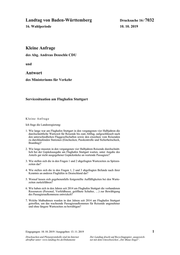 "content": "Landtag von Baden-Württemberg Drucksache 16 / 7032 16. Wahlperiode 10. 10. 2019 Kleine Anfrage des Abg. Andreas Deuschle CDU und Antwort des Ministeriums für Verkehr Servicesituation am Flughafen Stuttgart Kleine Anfrage Ich frage die Landesregierung: 1. Wie lange war am Flughafen Stuttgart in den vergangenen vier Halbjahren die durchschnittliche Wartezeit für Reisende bis zum Abflug, aufgeschlüsselt nach den unterschiedlichen Fluggesellschaften sowie den einzelnen vom Reisenden zu durchlaufenden Stationen (Einchecken, Passkontrolle und Sicherheitscheck, Boarding)? 2. Wie lange mussten in den vergangenen vier Halbjahren Reisende durchschnitt- lich bei der Gepäckausgabe am Flughafen Stuttgart warten, unter Angabe des Anteils gar nicht ausgegebener Gepäckstücke an wartende Passagiere? 3. Wie stellen sich die in den Fragen 1 und 2 abgefragten Wartezeiten zu Spitzen- zeiten dar? 4. Wie stellen sich die in den Fragen 1, 2 und 3 abgefragten Befunde nach ihrer Kenntnis an anderen Flughäfen in Deutschland dar? 5. Worauf lassen sich gegebenenfalls festgestellte Auffälligkeiten bei den Warte- zeiten zurückführen? 6. Wie haben sich in den Jahren seit 2014 am Flughafen Stuttgart die vorhandenen Ressourcen (Personal, Vorfeldbusse, geöffnete Schalter, …) zur Bewältigung des Passagieraufkommens entwickelt? 7. Welche Maßnahmen wurden in den Jahren seit 2014 am Flughafen Stuttgart getroffen, um das wachsende Passagieraufkommen für Reisende angenehmer und ohne längere Wartezeiten zu bewältigen? Eingegangen: 10. 10. 2019 / Ausgegeben: 13. 11. 2019 1 Drucksachen und Plenarprotokolle sind im Internet Der Landtag druckt auf Recyclingpapier, ausgezeich- abrufbar unter: www.landtag-bw.de/Dokumente net mit dem Umweltzeichen „Der Blaue Engel“.",