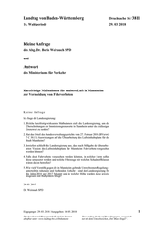 "content": "Landtag von Baden-Württemberg Drucksache 16 / 3811 16. Wahlperiode 29. 03. 2018 Kleine Anfrage des Abg. Dr. Boris Weirauch SPD und Antwort des Ministeriums für Verkehr Kurzfristige Maßnahmen für saubere Luft in Mannheim zur Vermeidung von Fahrverboten Kleine Anfrage Ich frage die Landesregierung: 1. Welche kurzfristig wirksamen Maßnahmen sieht die Landesregierung, um die Überschreitungen der Immissionsgrenzwerte in Mannheim unter den zulässigen Grenzwert zu senken? 2. Hat das Urteil des Bundesverwaltungsgerichts vom 27. Februar 2018 (BVerwG 7 C 30.17) Auswirkungen auf die Überarbeitung des Luftreinhalteplans für die Stadt Mannheim? 3. Inwiefern schließt die Landesregierung aus, dass nach Maßgabe der überarbei- teten Version des Luftreinhalteplans für Mannheim Fahrverbote vorgesehen werden können? 4. Falls doch Fahrverbote vorgesehen werden könnten, in welcher Form sollen diese umgesetzt werden und welche Fahrzeuge mit welchen Schadstoffklassen wären davon betroffen? 5. Wie viele Verstöße gegen die in Mannheim geltende Umweltzonen-Regelung – unterteilt in ruhenden und fließenden Verkehr – sind der Landesregierung für die Jahre 2016 und 2017 bekannt und in welcher Höhe wurden diese jeweils insgesamt mit Bußgeldern belegt? 29. 03. 2017 Dr. Weirauch SPD Eingegangen: 29. 03. 2018 / Ausgegeben: 16. 05. 2018 1 Drucksachen und Plenarprotokolle sind im Internet Der Landtag druckt auf Recyclingpapier, ausgezeich- abrufbar unter: www.landtag-bw.de/Dokumente net mit dem Umweltzeichen „Der Blaue Engel“.",