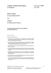 "content": "Landtag von Baden-Württemberg Drucksache 16 / 4559 16. Wahlperiode 27. 07. 2018 Kleine Anfrage des Abg. Reinhold Gall SPD und Antwort des Ministeriums für Finanzen Trennung zwischen Exekutive und Legislative im Finanzministerium Kleine Anfrage Ich frage die Landesregierung: 1. Wie grenzt das von einem Mitglied der Landtagsfraktion von Bündnis 90/Die Grünen geführte Finanzministerium seine Arbeit von der Arbeit der Landtags- fraktion von Bündnis 90/Die Grünen ab? 2. Zu welchem Zweck legt das Finanzministerium eine Broschüre der Landtags- fraktion von Bündnis 90/Die Grünen mit dem Titel „Kurzer Draht“ im öffent- lich zugänglichen Eingangsbereich des Ministeriums aus? 3. Wer hat die Auslage dieser Broschüre genehmigt und aus welchem Grund wur- de dies genehmigt? 4. Seit wann wird die Informationsbroschüre „Kurzer Draht“ der Landtagsfraktion von Bündnis 90/Die Grünen im Finanzministerium angeboten und in welchem Umfang? 5. Liegen auch in anderen Ministerien des Landes Broschüren bzw. Material der Öffentlichkeitsarbeit aus, deren Herausgeber die Landtagsfraktion von Bündnis 90/Die Grünen ist? 6. Liegen auch in den von CDU-Mitgliedern geführten Ministerien Informations- broschüren der CDU-Landtagsfraktion aus? 7. Ist es für die Landesregierung üblich, die Landesvertretung Baden-Württemberg für Parteiveranstaltungen zu nutzen und dazu über die Landesvertretung einla- den zu lassen? Eingegangen: 27. 07. 2018 / Ausgegeben: 30. 08. 2018 1 Drucksachen und Plenarprotokolle sind im Internet Der Landtag druckt auf Recyclingpapier, ausgezeich- abrufbar unter: www.landtag-bw.de/Dokumente net mit dem Umweltzeichen „Der Blaue Engel“.",
