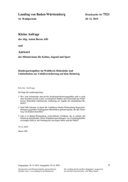"content": "Landtag von Baden-Württemberg Drucksache 16 / 7521 16. Wahlperiode 20. 12. 2019 Kleine Anfrage des Abg. Anton Baron AfD und Antwort des Ministeriums für Kultus, Jugend und Sport Kindergartenplätze im Wahlkreis Hohenlohe und Unklarheiten zur Unfallversicherung auf dem Heimweg Kleine Anfrage Ich frage die Landesregierung: 1. Wie viele kommunale und private Kindergartenbetreuungsplätze gibt es nach ihrer Kenntnis jeweils in den verschiedenen Städten und Gemeinden des Wahl- kreises Hohenlohe (tabellarische Auflistung mit Angabe des tatsächlichen Be- darfs)? 2. Sind Fälle bekannt, in denen die Unfallkasse Baden-Württemberg Regressfor- derungen gegenüber Kindergarten-Mitarbeitern geltend machte, die den Heim- weg von Kindern betreffen? 3. Gab es in Baden-Württemberg zivilrechtliche Verfahren, die in solchen den Heimweg betreffenden Fällen Schadenersatzzahlungen von Erziehungskräften erzwangen (falls ja, mit Nennung des jeweiligen Jahres und der Höhe)? 19. 12. 2019 Baron AfD Eingegangen: 20. 12. 2019 / Ausgegeben: 03. 02. 2020 1 Drucksachen und Plenarprotokolle sind im Internet Der Landtag druckt auf Recyclingpapier, ausgezeich- abrufbar unter: www.landtag-bw.de/Dokumente net mit dem Umweltzeichen „Der Blaue Engel“.",