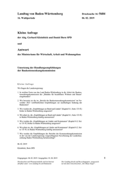 "content": "Landtag von Baden-Württemberg Drucksache 16 / 5684 16. Wahlperiode 06. 02. 2019 Kleine Anfrage der Abg. Gerhard Kleinböck und Daniel Born SPD und Antwort des Ministeriums für Wirtschaft, Arbeit und Wohnungsbau Umsetzung der Handlungsempfehlungen der Baukostensenkungskommission Kleine Anfrage Wir fragen die Landesregierung: 1. In welcher Form war das Land Baden-Württemberg in die Arbeit der Baukos- tensenkungskommission des „Bündnis für bezahlbares Wohnen und Bauen“ eingebunden? 2. Wie bewertet sie die im „Bericht der Baukostensenkungskommission“ im No- vember 2015 veröffentlichten Empfehlungen zur nachhaltigen Senkung der Baukosten? 3. Wie wurden die „Empfehlungen an Bund und Länder“ (Kapitel 8.1, Seite 133 ff.) bisher in Baden-Württemberg umgesetzt? 4. Wie plant sie, die „Empfehlungen an Bund und Länder“ (Kapitel 8.1, Seite 133 ff.) in Baden-Württemberg künftig umzusetzen? 5. Wie wurden die „Empfehlungen an Länder und Kommunen“ (Kapitel 8.2, Sei- te 135 ff.) bisher in Baden-Württemberg umgesetzt? 6. Wie plant sie, die „Empfehlungen an Länder und Kommunen“ (Kapitel 8.2, Sei- te 135 ff.) in Baden-Württemberg künftig umzusetzen? 7. Wie wurden die Empfehlungen des Berichts der Kostensenkungskommission in der von der Landesregierung vorgeschlagenen Novellierung der Landesbau- ordnung Baden-Württemberg berücksichtigt? 06. 02. 2019 Kleinböck, Born SPD Eingegangen: 06. 02. 2019 / Ausgegeben: 01. 04. 2019 1 Drucksachen und Plenarprotokolle sind im Internet Der Landtag druckt auf Recyclingpapier, ausgezeich- abrufbar unter: www.landtag-bw.de/Dokumente net mit dem Umweltzeichen „Der Blaue Engel“.",