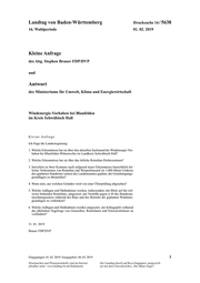 "content": "Landtag von Baden-Württemberg Drucksache 16 / 5638 16. Wahlperiode 01. 02. 2019 Kleine Anfrage des Abg. Stephen Brauer FDP/DVP und Antwort des Ministeriums für Umwelt, Klima und Energiewirtschaft Windenergie-Vorhaben bei Blaufelden im Kreis Schwäbisch Hall Kleine Anfrage Ich frage die Landesregierung: 1. \u0007Welche Erkenntnisse hat sie über den aktuellen Sachstand der Windenergie-Vor- haben bei Blaufelden-Wittenweiler im Landkreis Schwäbisch Hall? 2. Welche Erkenntnisse hat sie über das örtliche Rotmilan-Dichtezentrum? 3. \u0007Inwiefern ist ihrer Kenntnis nach aufgrund neuer Erkenntnisse hinsichtlich ört- licher Vorkommen von Rotmilan und Wespenbussard im 1.000-Meter-Umkreis des geplanten Standortes seitens des Landratsamtes geplant, die Genehmigungs- grundlagen zu überprüfen? 4. Wenn nein, aus welchen Gründen wird von einer Überprüfung abgesehen? 5. \u0007Welche Auflagen und Maßnahmen werden, insbesondere mit Blick auf die teil- weise brütenden Rotmilane, umgesetzt, um Verstöße gegen § 44 des Bundesna- turschutzgesetzes während des Baus und des Betriebs der geplanten Windener- gieanlagen zu verhindern? 6. \u0007Welche Auflagen und Maßnahmen werden umgesetzt, um Schlagopfer während des jährlichen Vogelzugs von Graureiher, Rotmilanen und Schwarzmilanen zu verhindern? 31. 01. 2019 Brauer FDP/DVP Eingegangen: 01. 02. 2019 / Ausgegeben: 06. 03. 2019 1 Drucksachen und Plenarprotokolle sind im Internet Der Landtag druckt auf Recyclingpapier, ausgezeich- abrufbar unter: www.landtag-bw.de/Dokumente net mit dem Umweltzeichen „Der Blaue Engel“.",