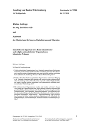"content": "Landtag von Baden-Württemberg Drucksache 16 / 5344 16. Wahlperiode 06. 12. 2018 Kleine Anfrage des Abg. Emil Sänze AfD und Antwort des Ministeriums für Inneres, Digitalisierung und Migration Immobilien im Eigentum bzw. Besitz islamistischer und religiös-nationalistischer Organisationen islamischer Prägung Kleine Anfrage Ich frage die Landesregierung: 1. Welche islamischen Organisationen bzw. islamisch ausgerichteten Kulturorga- nisationen jeweils welcher konfessionellen Ausrichtung sind nach ihrer Kennt- nis in jeweils welcher Mitgliederstärke seit wann in jeweils welcher rechtlichen Form (tabellarische Auflistung erbeten) in Baden-Württemberg aktiv? 2. Welche ethnisch-kulturell ausgerichteten Organisationen islamischer Prägung (z. B. Türkische Gemeinde oder ähnliche) mit jeweils welcher ethnisch-kultu- rellen Ausrichtung sind nach ihrer Kenntnis in jeweils welcher Mitgliederstärke seit wann in jeweils welcher rechtlichen Form (tabellarische Auflistung erbe- ten) in Baden-Württemberg aktiv? 3. Mit welchen dieser Organisationen wurden oder werden seit dem 1. Januar 2010 seitens der Landesregierung und, soweit bekannt, anderen Autoritäten des gesellschaftlich-politischen Lebens (z. B. Stellen im Verantwortungsbereich der Landesregierung, von Kommunen, Interessenverbänden, von kirchlichen Stel- len oder anderen Körperschaften öffentlichen Rechts) jeweils welche institutio- nalisierten sogenannten „Islam-Dialoge“, „Integrationsdialoge“ oder vergleich- bare Formate mit bisher welchen konkreten Ergebnissen (z. B. öffentliche Ab- sichtserklärungen, Zielvereinbarungen, rechtlich wirksame Vereinbarungen) ge- führt? Eingegangen: 06. 12. 2018 / Ausgegeben: 25. 01. 2019 1 Drucksachen und Plenarprotokolle sind im Internet Der Landtag druckt auf Recyclingpapier, ausgezeich- abrufbar unter: www.landtag-bw.de/Dokumente net mit dem Umweltzeichen „Der Blaue Engel“.",
