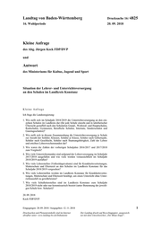 "content": "Landtag von Baden-Württemberg Drucksache 16 / 4825 16. Wahlperiode 20. 09. 2018 Kleine Anfrage des Abg. Jürgen Keck FDP/DVP und Antwort des Ministeriums für Kultus, Jugend und Sport Situation der Lehrer- und Unterrichtsversorgung an den Schulen im Landkreis Konstanz Kleine Anfrage Ich frage die Landesregierung: 1. Wie stellt sich im Schuljahr 2018/2019 die Unterrichtsversorgung an den ein- zelnen Schulen im Landkreis dar (für jede Schule einzeln und in tabellarischer Übersicht gestaffelt nach den Schularten Grund-, Werkreal- und Hauptschulen, Realschulen, Gymnasien, Berufliche Schulen, Internate, Sonderschulen und Ganztagsschulen)? 2. Wie stellt sich in diesem Zusammenhang die Unterrichtsversorgung je Schule zur Anzahl der Schüler, Klassen, Schüler je Klasse, Schüler nach Geburtsjahr, Schüler nach Geschlecht, Schüler nach Staatsangehörigkeit, Zahl der Lehrer und erteilten Lehrerwochenstunden dar? 3. Wie waren die Zahlen der vorherigen Schuljahre 2016/2017 und 2017/2018 zum Vergleich? 4. Wie viele Unterrichtsstunden sind aufgrund der Lehrerversorgung im Schuljahr 2017/2018 ausgefallen und wie viele werden voraussichtlich im Schuljahr 2018/2019 ausfallen? 5. Wie viele Lehrerstellen (Vollzeitäquivalente) sind für Krankheitsvertretungen, Mutterschutz und Elternzeit an den Schulen im Landkreis Konstanz für das Schuljahr 2018/2019 vorgesehen? 6. Wie viele Lehrerstellen werden im Landkreis Konstanz für Krankheitsvertre- tungen, Mutterschutz und Elternzeit benötigt, um einen Unterricht ohne Unter- richtsausfall zu gewährleisten? 7. Wie viele Schulleiterstellen sind im Landkreis Konstanz zum Schuljahr 2018/2019 nicht oder nur kommissarisch besetzt (unter Benennung der jeweili- gen Schule bzw. Schulart)? 20. 09. 2018 Keck FDP/DVP Eingegangen: 20. 09. 2018 / Ausgegeben: 12. 11. 2018 1 Drucksachen und Plenarprotokolle sind im Internet Der Landtag druckt auf Recyclingpapier, ausgezeich- abrufbar unter: www.landtag-bw.de/Dokumente net mit dem Umweltzeichen „Der Blaue Engel“.",