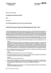 "content": "Thüringer Landtag Drucksache 7/ 2275 7. Wahlperiode 07.12.2020 Kleine Anfrage des Abgeordneten Mühlmann (AfD) und Antwort des Thüringer Ministeriums für Inneres und Kommunales Polizeiliche Planungen aufgrund der Bundesgartenschau 2021 - Teil II Trotz der Einschränkungen aufgrund der pandemischen Situation im Jahr 2020 wurde zwischenzeitlich von der Landeshauptstadt Erfurt die Durchführung der Bundesgartenschau (BUGA) im Jahr 2021 bestätigt. Auf- grund der zu erwartenden Besucherzahlen, die voraussichtlich die üblichen touristischen Besucherzahlen deutlich übersteigen, wurden auch seitens der Thüringer Polizei Maßnahmen initiiert, die der Gewährleistung der öffentlichen Sicherheit und Ordnung im Rahmen dieses Großereignisses in der Landeshauptstadt dienen. Das Thüringer Ministerium für Inneres und Kommunales hat die Kleine Anfrage 7/1292 vom 8. Oktober 2020 namens der Landesregierung mit Schreiben vom 7. Dezember 2020 (Datum des Eingangs) beantwortet: 1. Auf welchem Konzept wird die sogenannte BUGA-Wache aufgebaut und was sieht dieses konkret vor? Antwort: Der Begriff \"BUGA-Wache\" bezeichnet die Gesamtheit der personellen, materiellen und strukturellen Maßnahmen zur Umsetzung des polizeilichen Einsatzes. Insbesondere aufgrund der Anzahl der zu er- wartenden Gäste, der zeitlichen Dauer und der Größenordnung von Veranstaltungen anlässlich der Bundesgartenschau wurde zur Bündelung der dafür erforderlichen Ressourcen eine zeitlich begrenzte \"BUGA-Wache\" eingerichtet. Durch die \"BUGA-Wache\" sollen insbesondere die erforderlichen polizeili- chen Präsenzmaßnahmen im Veranstaltungsraum der Bundesgartenschau 2021 gewährleistet werden. 2. Wie viel Personal wird ab wann durch die Thüringer Polizei zur Besetzung der BUGA-Wache geplant (bitte um Gliederung nach Laufbahngruppe)? Antwort: Die personellen Planungen befinden sich noch in der Abstimmung. 3. Aus welchen Dienststellen und in welchem Umfang pro Behörde werden die Beamten für die BUGA-Wa- che abgezogen (bitte um Gliederung nach Laufbahngruppe)? Antwort: Auf die Antwort zu Frage 2 wird verwiesen. 4. Welche polizeilichen Aufgaben können aufgrund der Entsendung zur BUGA-Wache in welchen Dienst- stellen nicht mehr bearbeitet werden oder wie werden die Aufgaben derjenigen, die zur Sicherung der Bundesgartenschau entsendet werden, in den einzelnen Dienststellen kompensiert? Antwort: Es liegen gegenwärtig keine Erkenntnisse vor, dass polizeiliche Aufgaben aufgrund der Bundesgarten- schau 2021 nicht erfüllt werden können. Druck: Thüringer Landtag, 6. Januar 2021",