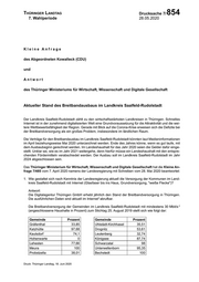 "content": "Thüringer Landtag Drucksache 7/ 854 7. Wahlperiode 28.05.2020 Kleine Anfrage des Abgeordneten Kowalleck (CDU) und Antwort des Thüringer Ministeriums für Wirtschaft, Wissenschaft und Digitale Gesellschaft Aktueller Stand des Breitbandausbaus im Landkreis Saalfeld-Rudolstadt Der Landkreis Saalfeld-Rudolstadt zählt zu den wirtschaftsstärksten Landkreisen in Thüringen. Schnelles Internet ist in der zunehmend digitalisierten Welt eine Grundvoraussetzung für die Attraktivität und die wei- tere Wettbewerbsfähigkeit der Region. Gerade mit Blick auf die Corona-Krise erweisen sich die Defizite bei der Breitbandversorgung als ein großes Problem, insbesondere im ländlichen Raum. Die Verträge für den Breitbandausbau im Landkreis Saalfeld-Rudolstadt könnten laut Medieninformationen im April beziehungsweise Mai 2020 unterzeichnet werden. Ende des Jahres könne, wenn es gut laufe, mit dem Ausbaubeginn gerechnet werden. Im Landeshaushalt für das Jahr 2020 seien die Gelder dafür einge- stellt. Unklar sei, wie es im Jahr 2021 weitergehe, denn hierfür müsse ein Landeshaushalt mit den entspre- chenden Fördermitteln verabschiedet werden. Der Ausbau soll im Landkreis Saalfeld-Rudolstadt im Jahr 2024 abgeschlossen sein. Das Thüringer Ministerium für Wirtschaft, Wissenschaft und Digitale Gesellschaft hat die Kleine An- frage 7/485 vom 7. April 2020 namens der Landesregierung mit Schreiben vom 28. Mai 2020 beantwortet: 1. Wie gestaltet sich nach Kenntnis der Landesregierung aktuell die Versorgung der Kommunen im Land- kreis Saalfeld-Rudolstadt mit Internet (Glasfaser bis ins Haus, Grundversorgung, \"weiße Flecke\")? Antwort: Die Digitalagentur Thüringen GmbH erhebt jährlich den Stand der Breitbandversorgung in Thüringen. Die ausführlichen Daten sind aktuell im Internet1 abrufbar. Die Breitbandversorgung der Gemeinden im Landkreis Saalfeld-Rudolstadt mit mindestens 30 Mbit/s 2 (angeschlossene Haushalte in Prozent) zum Stichtag 25. August 2019 stellt sich wie folgt dar: Gemeinde Prozent Gemeinde Prozent Gräfenthal 33,85 Uhlstädt-Kirchhasel 35,51 Katzhütte 97,68 Drognitz 53,61 Kaulsdorf 74,1 Leutenberg 32,74 Hohenwarte 0 Königsee 87,74 Lehesten 77,66 Schwarzatal 98 Meura 100 Unterwellenborn 95,35 Probstzella 38,01 Bechstedt 100 Druck: Thüringer Landtag, 18. Juni 2020",