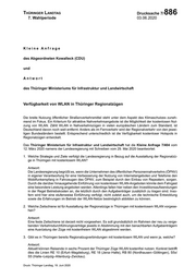 "content": "Thüringer Landtag Drucksache 7/ 886 7. Wahlperiode 03.06.2020 Kleine Anfrage des Abgeordneten Kowalleck (CDU) und Antwort des Thüringer Ministeriums für Infrastruktur und Landwirtschaft Verfügbarkeit von WLAN in Thüringer Regionalzügen Die breite Nutzung öffentlicher Straßenverkehrsmittel steht unter dem Aspekt des Klimaschutzes zuneh- mend im Fokus. Ein Kriterium für attraktive Nahverkehrsangebote ist die Möglichkeit der kostenlosen Nut- zung von WLAN. Zählt WLAN in Nahverkehrszügen in vielen europäischen Ländern zum Standard, ist Deutschland davon noch weit entfernt. Anders als im Fernverkehr wird der Regionalverkehr von den jewei- ligen Bundesländern bestellt. Entsprechend unterschiedlich ist die Verfügbarkeit kostenloser Hotspots in Regionalzügen entwickelt. Das Thüringer Ministerium für Infrastruktur und Landwirtschaft hat die Kleine Anfrage 7/404 vom 12. März 2020 namens der Landesregierung mit Schreiben vom 29. Mai 2020 beantwortet: 1. Welche Strategie und Ziele verfolgt die Landesregierung in Bezug auf die Ausstattung der Regionalzü- ge in Thüringen mit kostenlosem WLAN? Antwort: Die Landesregierung begrüßt es, wenn die Unternehmen des öffentlichen Personennahverkehrs (ÖPNV) in eigener Verantwortung für eine Verbesserung der Nutzung von Internetangeboten und Telefonie den Mobilfunkempfang in Fahrzeugen des ÖPNV, zum Beispiel durch den Einbau von Repeatern, sorgen. Durch die darüber hinausgehende Einführung von kostenlosen WLAN-Angeboten könnte dem Fahrgast eine besondere Leistung angeboten werden. Allerdings fallen hier neben den Investitionsaufwendungen in der Regel Betriebskosten an, die letztlich durch den Aufgabenträger zusätzlich zu tragen sind. Inso- fern wird hier eine stufenweise Einführung verfolgt, nicht zuletzt auch, um die technische Entwicklung sowie die Erfahrungen im Betrieb der WLAN-Netze bestmöglich abbilden zu können. 2. Welche Zeitschiene ist für Ausstattung der Regionalzüge in Thüringen mit kostenlosem WLAN vorgese- hen? Antwort: Eine feste Zeitschiene ist derzeit nicht vorgesehen. Es soll grundsätzlich im Rahmen der neu zu verge- benden Verkehrsdurchführungsverträge jeweils in Abstimmung mit den benachbarten Aufgabenträgern eine Ausrüstung der Züge mit kostenfreiem WLAN abgestimmt werden. 3. Gibt es in Thüringen bereits Regionalzugverbindungen mit kostenlosem WLAN und wenn ja, welche? Antwort: Aktuell können Reisende in sechs Prozent der Thüringer Züge WLAN kostenfrei nutzen. Konkret betrifft dies die Linien RE 10 (Erfurt–Magdeburg), RE 18 (Jena–Halle), RB 80 (Nordhausen–Göttingen), S5x/ S5 (Halle–Leipzig–Altenburg–Zwickau). Druck: Thüringer Landtag, 19. Juni 2020",