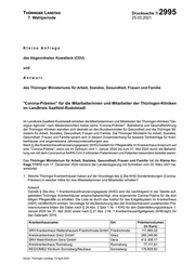 "content": "Thüringer Landtag Drucksache 7/ 2995 7. Wahlperiode 25.03.2021 Kleine Anfrage des Abgeordneten Kowalleck (CDU) und Antwort des Thüringer Ministeriums für Arbeit, Soziales, Gesundheit, Frauen und Familie \"Corona-Prämien\" für die Mitarbeiterinnen und Mitarbeiter der Thüringen-Kliniken im Landkreis Saalfeld-Rudolstadt Im Landkreis Saalfeld-Rudolstadt erhielten die Mitarbeiterinnen und Mitarbeiter der Thüringen-Kliniken \"Ge- orgius Agricola\" nach Medienberichten bisher keine \"Corona-Prämien\". Betriebsrat und Geschäftsführung der Thüringen-Kliniken wandten sich deshalb an den Bundesminister für Gesundheit und die Thüringer Mi- nisterin für Arbeit, Soziales, Gesundheit, Frauen und Familie. Die Thüringer Ministerin für Arbeit, Soziales, Gesundheit, Frauen und Familie sprach sich in diesem Zusammenhang für bessere Tarifverträge für Kran- kenhäuser und angemessene Jahressonderzahlungen aus. Nach § 26a Krankenhausfinanzierungsgesetz (KHG) besteht für Pflegekräfte im Krankenhaus Anspruch auf eine \"Corona-Prämie\", wenn sie im Zeitraum vom 1. Januar 2020 bis zum 31. Mai 2020 durch die Behand- lung von mit dem Coronavirus SARS-CoV-2 infizierten Patientinnen und Patienten besonders belastet waren. Das Thüringer Ministerium für Arbeit, Soziales, Gesundheit, Frauen und Familie hat die Kleine An- frage 7/1512 vom 17. Dezember 2020 namens der Landesregierung mit Schreiben vom 25. März 2021 be- antwortet: 1. Welche Thüringer Krankenhäuser haben auf der Grundlage des § 26a KHG Sonderleistungen (Corona- Prämien) in welcher Höhe für ihre Mitarbeiterinnen und Mitarbeiter erhalten? Antwort: Gemäß § 26a Abs. 1 Krankenhausfinanzierungsgesetz (KHG) sind die nachfolgend in der Tabelle auf- gelisteten Thüringer Krankenhäuser anspruchsberechtigt, eine sogenannte Corona-Prämie für die dort tätigen Pflegekräfte zu erhalten. Die Liste ist durch das Institut für das Entgeltsystem im Krankenhaus (InEK) veröffentlicht worden. Grundlage für die Berechnung des den Krankenhäusern zustehenden Prä- mienvolumens bilden die Daten nach § 24 Abs. 2 Satz 1 Nr. 1 KHG für den Datenlieferungszeitraum 1. Januar 2020 bis 31. Mai 2020 sowie nach § 21 Abs. 2 Nr. 1 Krankenhausentgeltgesetz (KHEntgG) für das Datenjahr 2019. Krankenhausname Ort Prämienvolumen (in Euro) SRH Krankenhaus Waltershausen-Friedrichroda GmbH Friedrichroda 111.865,02 Kreiskrankenhaus Greiz GmbH Greiz 285.248,95 SRH Wald-Klinikum Gera GmbH Gera 412.308,17 Kreiskrankenhaus Ronneburg Ronneburg 77.111,81 REGIOMED Klinikum Sonneberg/Neuhaus Sonneberg 176.805,50 Druck: Thüringer Landtag, 13 April 2021",