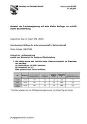 "content": "Landtag von Sachsen-Anhalt Drucksache 6/365 01.09.2011 Antwort der Landesregierung auf eine Kleine Anfrage zur schrift- lichen Beantwortung Abgeordnete Eva von Angern (DIE LINKE) Anordnung und Vollzug der Untersuchungshaft in Sachsen-Anhalt Kleine Anfrage - KA 6/7148 Antwort der Landesregierung erstellt vom Ministerium für Justiz und Gleichstellung 1. Wie häufig wurde seit 2009 bis heute Untersuchungshaft bei Erwachse- nen verhängt a) U-Haftrate pro 100.000 Einwohner, b) U-Haftanteil (in %)? Bitte getrennt nach Jahren auflisten. Anteil pro Anteil zur Be- durchschnittlicher erwachsene U-Haft-Anteil in % zum Jahr Bevölkerung 100.000 Ein- völkerung in Gefangenenbestand* U-Gefangene* Gesamtgefangenenbestand wohner % 2009 2.356.219 2.175 162 6,88 0,0069 7,47 2010 2.335.006 2.081 146 6,25 0,0063 7,02 per 2.327.052 2.059 138 5,93 0,0059 6,70 30.4.2011 * Die Daten ergeben sich aus Stichtagserhebungen jeweils zum letzten Tag des Monats. (Ausgegeben am 07.09.2011)",