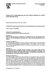 "content": "Landtag von Sachsen-Anhalt Drucksache 6/1439 17.09.2012 Antwort der Landesregierung auf eine Kleine Anfrage zur schrift- lichen Beantwortung Abgeordnete Monika Hohmann (DIE LINKE) Frühkindliche Sprachstandserhebung und Sprachförderung in Sachsen-Anhalt Kleine Anfrage - KA 6/7586 Antwort der Landesregierung erstellt vom Ministerium für Arbeit und Soziales Frage Nr. 1: Wie viele Kinder nahmen im Zeitraum von 2009 bis 2011 an den Sprachstands- tests in den Kindertageseinrichtungen teil? Bitte geschlechtsspezifisch dar- stellen. Antwort zu Frage Nr. 1: Im Kindergartenjahr 2009/2010 nahmen insgesamt 16.066 Kinder in Sachsen-Anhalt an der Sprachstandsfeststellung teil. Davon waren 7.787 weiblich und 8.279 männ- lich. Für das Kindergartenjahr 2010/2011 konnte die Auswertung noch nicht abge- schlossen werden. Frage Nr. 2: Wie viele der unter 1. erfragten Kinder erhielten in den Jahren 2009 bis 2011 anschließende Sprachförderung? Bitte geschlechtsspezifisch darstellen und die Anteile der Kinder, die Sprachförderung in und außerhalb (Logopädie) der Kindertageseinrichtungen erhielten, darstellen. Antwort zu Frage Nr. 2: Im Kindergartenjahr 2009/2010 wurde im Rahmen der gemäß § 36 Abs. 2a Schulge- setz des Landes Sachsen-Anhalt (SchulG LSA) durchgeführten Sprachstandsfest- stellung bei 1.711 Kindern (722 weiblich und 989 männlich) festgestellt, dass sie eine über das übliche Maß hinausgehende pädagogische Unterstützung bei der Entwick- lung ihrer Sprachkompetenz bzw. bei der Aneignung der deutschen Sprache benöti- gen. Für diese Kinder war gemäß § 36 Abs. 2b SchulG LSA die Teilnahme an geziel- ten zusätzlichen pädagogischen Sprachfördermaßnahmen in der Kindertageseinrich- tung im Kindergartenjahr 2010/2011 verpflichtend. Da für dieses Kindergartenjahr die (Ausgegeben am 17.09.2012)",