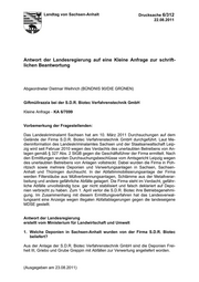 "content": "Landtag von Sachsen-Anhalt Drucksache 6/312 22.08.2011 Antwort der Landesregierung auf eine Kleine Anfrage zur schrift- lichen Beantwortung Abgeordneter Dietmar Weihrich (BÜNDNIS 90/DIE GRÜNEN) Giftmüllrazzia bei der S.D.R. Biotec Verfahrenstechnik GmbH Kleine Anfrage - KA 6/7099 Vorbemerkung der Fragestellenden: Das Landeskriminalamt Sachsen hat am 10. März 2011 Durchsuchungen auf dem Gelände der Firma S.D.R. Biotec Verfahrenstechnik GmbH durchgeführt. Laut Me- dieninformation des Landeskriminalamtes Sachsen und der Staatsanwaltschaft Leip- zig wird seit Februar 2010 wegen des Verdachts des unerlaubten Betreibens von An- lagen gemäß § 327 Abs. 2 StGB gegen die Geschäftsführer der Firma ermittelt. Nach den Ermittlungen wurden Durchsuchungsbeschlüsse vom Amtsgericht Leipzig wegen des unerlaubten Betreibens von Anlagen vollstreckt. Dabei wurden die Firma in Poh- ritzsch sowie mehrere Deponien und Verwertungsanlagen in Sachsen, Sachsen- Anhalt und Thüringen durchsucht. In der Abfallimmobilisierungsanlage der Firma werden Filterstäube aus Müllverbrennungsanlagen, Schlämme aus der Metallverar- beitung und andere gefährliche Abfälle gelagert. Die Firma steht im Verdacht, gefähr- liche Abfälle unvollständig bzw. gar nicht stabilisiert und falsch deklariert auf Depo- nien verbracht zu haben. Zum 1. April verlor die S.D.R. Biotec ihre Betriebsgenehmi- gung. Im Zusammenhang mit diesem Ermittlungsverfahren hat das Landesverwal- tungsamt eine Anzeige wegen illegalen Abfallablagerungen gegen die landeseigene MDSE gestellt. Antwort der Landesregierung erstellt vom Ministerium für Landwirtschaft und Umwelt 1. Welche Deponien in Sachsen-Anhalt wurden von der Firma S.D.R. Biotec beliefert? Aus der Anlage der S.D.R. Biotec Verfahrenstechnik GmbH sind die Deponien Frei- heit III, Griebo und Grube Greppin mit Abfällen zur Verwertung angeliefert worden. (Ausgegeben am 23.08.2011)",