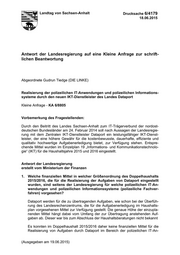 "content": "Landtag von Sachsen-Anhalt Drucksache 6/4179 18.06.2015 Antwort der Landesregierung auf eine Kleine Anfrage zur schrift- lichen Beantwortung Abgeordnete Gudrun Tiedge (DIE LINKE) Realisierung der polizeilichen IT-Anwendungen und polizeilichen Informations- systeme durch den neuen IKT-Dienstleister des Landes Dataport Kleine Anfrage - KA 6/8805 Vorbemerkung des Fragestellenden: Durch den Beitritt des Landes Sachsen-Anhalt zum IT-Trägerverbund der nordost- deutschen Bundesländer am 24. Februar 2014 soll nach Aussagen der Landesregie- rung mit dem Zentralen IKT-Dienstleister Dataport ein leistungsfähiger IKT-Dienst- leister, der eine höhere Gewähr für die kostenbewusste, dauerhafte, effiziente und qualitativ hochwertige Aufgabenerledigung bietet, zur Verfügung stehen. Entspre- chende Mittel wurden im Einzelplan 19 „Informations- und Kommunikationstechnolo- gie“ (IKT) für die Haushaltsjahre 2015 und 2016 eingestellt. Antwort der Landesregierung erstellt vom Ministerium der Finanzen 1. Welche finanziellen Mittel in welcher Größenordnung des Doppelhaushalts 2015/2016, die für die Realisierung der Aufgaben von Dataport eingestellt wurden, sind seitens der Landesregierung für welche polizeilichen IT-An- wendungen und polizeilichen Informationssysteme (polizeiliche Fachver- fahren) vorgesehen? Dataport werden für die zu übertragenden Aufgaben, wie schon bei der Überfüh- rung des Landesrechenzentrums, die für die Aufgabenerledigung im Haushalts- plan vorgesehenen Mittel zur Verfügung gestellt. Die genaue Höhe der einzupla- nenden Mittel hängt dabei vom Umfang der zur Übertragung anstehenden Auf- gaben ab. Dieser war bis zum Abschluss der Haushaltsberatungen nicht bekannt Es konnten im Doppelhaushalt 2015/2016 daher keine finanziellen Mittel für die Realisierung von Aufgaben durch Dataport im Bereich der polizeilichen IT-An- (Ausgegeben am 19.06.2015)",