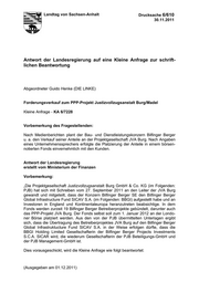 "content": "Landtag von Sachsen-Anhalt Drucksache 6/610 30.11.2011 Antwort der Landesregierung auf eine Kleine Anfrage zur schrift- lichen Beantwortung Abgeordneter Guido Henke (DIE LINKE) Forderungsverkauf zum PPP-Projekt Justizvollzugsanstalt Burg/Madel Kleine Anfrage - KA 6/7228 Vorbemerkung des Fragestellenden: Nach Medienberichten plant der Bau- und Dienstleistungskonzern Bilfinger Berger u. a. den Verkauf seiner Anteile an der Projektgesellschaft JVA Burg. Nach Angaben eines Unternehmenssprechers erfolgte die Platzierung der Anteile in einem börsen- notierten Fonds einvernehmlich mit den Kunden. Antwort der Landesregierung erstellt vom Ministerium der Finanzen Vorbemerkung: „Die Projektgesellschaft Justizvollzugsanstalt Burg GmbH & Co. KG (im Folgenden: PJB) hat sich mit Schreiben vom 27. September 2011 an den Leiter der JVA Burg gewandt und mitgeteilt, dass der Konzern Bilfinger Berger SE den Bilfinger Berger Global Infrastructure Fund SICAV S.A. (im Folgenden: BBGI) aufgestellt habe und an Investoren in England und Kontinentaleuropa heranzutreten beabsichtige. In dem Fonds werden zurzeit 19 Bilfinger Berger Betreiberprojekte gebündelt, darunter auch das PPP-Projekt JVA Burg. Der Fonds selbst soll zum 1. Januar 2012 an der Londo- ner Börse platziert werden. Aus den von der PJB übermittelten Unterlagen ergibt sich, dass die Übertragung des Betreiberprojektes JVA Burg auf den Bilfinger Berger Global Infrastruktucture Fund SICAV S.A. in der Weise erfolgen dürfte, dass die BBGI Holding Limited Gesellschafterin der Bilfinger Berger Projects Investments S.C.A. SICAR wird, die wiederum Gesellschafterin der PJB Beteiligungs-GmbH und der PJB Management-GmbH ist. Dies vorausgeschickt, wird die Kleine Anfrage wie folgt beantwortet: (Ausgegeben am 01.12.2011)",
