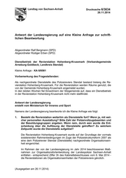 "content": "Landtag von Sachsen-Anhalt Drucksache 6/3634 26.11.2014 Antwort der Landesregierung auf eine Kleine Anfrage zur schrift- lichen Beantwortung Abgeordneter Ralf Bergmann (SPD) Abgeordneter Rüdiger Erben (SPD) Dienstbetrieb der Revierstation Hohenberg-Krusemark (Verbandsgemeinde Arneburg-Goldbeck, Landkreis Stendal) Kleine Anfrage - KA 6/8561 Vorbemerkung des Fragestellenden: Als nachgeordnete Dienststelle des Polizeireviers Stendal bestand bislang die Re- vierstation Hohenberg-Krusemark. Für die Revierstation werden Räume genutzt, die von der Gemeinde Hohenberg-Krusemark angemietet wurden. In den letzten Wochen fiel Einwohnern der Sitzgemeinde auf, dass ein Dienstbetrieb in der Revierstation Hohenberg-Krusemark nicht mehr stattfindet. Antwort der Landesregierung erstellt vom Ministerium für Inneres und Sport Namens der Landesregierung beantworte ich die Kleine Anfrage wie folgt: 1. Besteht die Revierstation weiterhin als Dienststelle fort? Wenn ja, mit wel- cher personellen Ausstattung? Bitte Zahl der Polizeivollzugsbeamten und der Besoldungsgruppen angeben. Wenn nein, durch wen wurde die Ent- scheidung über die Auflösung der Dienststelle getroffen? Zu welchem Zeitpunkt wurde die Dienststelle aufgelöst? Die Revierstation Hohenberg-Krusemark wurde auf der Grundlage der vormals existierenden Rahmenbedingungen im Zuge der Polizeistrukturreform 2007 als eine dem Polizeirevier Stendal (Dienststelle) nachgeordnete Organisationsein- heit eingerichtet. Im Rahmen der von der Landesregierung im Jahr 2014 beschlossenen Maß- nahmen zur Organisationsfortentwicklung der Landespolizei Sachsen-Anhalt entfallen - entsprechend Ziffer 3h des Kabinettsbeschlusses vom 6. Mai 2014 - die Revierstationen als Organisationseinheiten der Polizeireviere gänzlich. (Ausgegeben am 26.11.2014)",