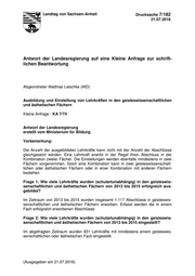 "content": "Landtag von Sachsen-Anhalt Drucksache 7/182 21.07.2016 Antwort der Landesregierung auf eine Kleine Anfrage zur schrift- lichen Beantwortung Abgeordneter Matthias Lieschke (AfD) Ausbildung und Einstellung von Lehrkräften in den geisteswissenschaftlichen und ästhetischen Fächern Kleine Anfrage - KA 7/74 Antwort der Landesregierung erstellt vom Ministerium für Bildung Vorbemerkung: Die Anzahl der ausgebildeten Lehrkräfte kann nicht mit der Anzahl der Abschlüsse gleichgesetzt werden. Eine Lehrkraft erwirbt in der Regel ihren Abschluss in der Kombination zweier Fächer. Die Einstellungen werden ebenfalls mindestens in zwei Fächern vorgenommen. Solch eine Kombination kann in zwei geisteswissenschaft- lichen oder ästhetischen Fächern oder in einer Kombination mit anderen Fächern bestehen. Frage 1: Wie viele Lehrkräfte wurden (schulartunabhängig) in den geisteswis- senschaftlichen und ästhetischen Fächern von 2013 bis 2015 erfolgreich aus- gebildet? Im Zeitraum von 2013 bis 2015 wurden insgesamt 1.117 Abschlüsse in geisteswis- senschaftlichen und ästhetischen Fächern erworben. Erfasst werden die in einem Fach erfolgreich erworbenen Abschlüsse. Frage 2: Wie viele Lehrkräfte wurden (schulartunabhängig) in den geisteswis- senschaftlichen und ästhetischen Fächern von 2013 bis 2015 eingestellt? Im abgefragten Zeitraum wurden 931 Lehrkräfte mit mindestens einem geisteswis- senschaftlichen oder ästhetischen Fach eingestellt. (Ausgegeben am 21.07.2016)",