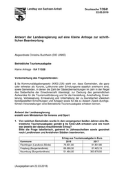 "content": "Landtag von Sachsen-Anhalt Drucksache 7/2641 22.03.2018 Antwort der Landesregierung auf eine Kleine Anfrage zur schrift- lichen Beantwortung Abgeordnete Christina Buchheim (DIE LINKE) Betriebliche Tourismusabgabe Kleine Anfrage - KA 7/1528 Vorbemerkung des Fragestellenden: § 9a Kommunalabgabengesetz (KAG-LSA) sieht vor, dass Gemeinden, die ganz oder teilweise als Kurorte, Luftkurorte oder Erholungsorte staatlich anerkannt sind, sowie Gemeinden, in denen die Zahl der Gästeübernachtungen im Jahr in der Regel das Siebenfache der Einwohnerzahl übersteigt, zur Deckung des gemeindlichen Aufwandes für die Tourismusförderung und für die Herstellung, Anschaffung, Erwei- terung, Verbesserung, Erneuerung und Unterhaltung der zu touristischen Zwecken bereitgestellten Einrichtungen und Anlagen sowie für die zu diesem Zweck durchge- führten Veranstaltungen eine Betriebliche Tourismusabgabe erheben können. Antwort der Landesregierung erstellt vom Ministerium für Inneres und Sport 1. Von welchen Gemeinden wurde in den vergangenen beiden Jahren eine Be- triebliche Tourismusabgabe gemäß § 9a KAG-LSA erhoben und wie hoch war jeweils der daraus resultierende Ertrag? Bitte die Frage tabellarisch, getrennt in Jahresscheiben sowie geordnet nach Landkreisen und kreisfreien Städten beantworten. Ertrag aus Tourismusabgabe in Euro Kommune 2016 2017 Flechtingen (Landkreis Börde) 79.831,80 81.831,80 Freyburg (Burgenlandkreis) 69.260,50 87.425,15 Naumburg (Burgenlandkreis) 51.464,00 363.678,50 (Ausgegeben am 22.03.2018)",