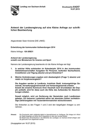 "content": "Landtag von Sachsen-Anhalt Drucksache 6/4257 16.07.2015 Antwort der Landesregierung auf eine Kleine Anfrage zur schrift- lichen Beantwortung Abgeordneter Swen Knöchel (DIE LINKE) Entwicklung der kommunalen Aufwendungen 2014 Kleine Anfrage - KA 6/8831 Antwort der Landesregierung erstellt vom Ministerium für Inneres und Sport Namens der Landesregierung beantworte ich die Kleine Anfrage wie folgt: 1. In welcher Höhe entstanden im Kalenderjahr 2014 in den kommunalen Gebietskörperschaften Ausgaben für Personal, laufenden Sachaufwand, Investitionen und Tilgung absolut und pro Einwohner? 2. Welche Veränderungen ergaben sich diesbezüglich (Frage 1) absolut und relativ im Vorjahresvergleich? Die Angaben werden je Landkreis, kreisfreie Stadt, kreisangehörige Ge- meinde, Verwaltungsgemeinschaft und Verbandsgemeinde erbeten. Soweit die einzelne Kommune ihren Haushalt nach Grundsätzen der Dop- pik aufstellt, wird für diese auch die Höhe des Aufwandes für Abschrei- bungen erbeten. Soweit möglich, wird um Sortierung der Gemeinden nach Landkreisen gebeten. Zur besseren Lesbarkeit wären bei absoluten Zahlen rechtsbün- dige Zahlenangaben mit Tausendertrennzeichen wünschenswert. Die Antworten zu den Fragen 1 und 2 sind den beigefügten Anlagen zu ent- nehmen. Hinweis: Die Drucksache steht vollständig digital im Internet/Intranet zur Verfügung. Die Anlage ist in Word als Objekt beigefügt und öffnet durch Doppelklick im Netz den Acrobat Reader. Bei Bedarf kann Einsichtnahme in der Bibliothek des Landtages von Sachsen-Anhalt erfolgen oder die gedruckte Form abgefordert werden. (Ausgegeben am 16.07.2015)",