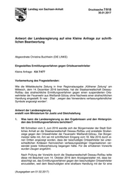 "content": "Landtag von Sachsen-Anhalt Drucksache 7/918 30.01.2017 Antwort der Landesregierung auf eine Kleine Anfrage zur schrift- lichen Beantwortung Abgeordnete Christina Buchheim (DIE LINKE) Eingestelltes Ermittlungsverfahren gegen Ortsfeuerwehrleiter Kleine Anfrage - KA 7/477 Vorbemerkung des Fragestellenden: Wie die Mitteldeutsche Zeitung in ihrer Regionalausgabe „Köthener Zeitung“ am Mittwoch, dem 14. Dezember 2016 berichtete, hat die Staatsanwaltschaft Dessau- Roßlau das strafrechtliche Ermittlungsverfahren gegen einen suspendierten Orts- wehrleiter der Feuerwehr aus Weißandt-Gölzau ohne Nachweis einer strafrechtlichen Handlung eingestellt. Er war - Zitat - „wegen des Verwendens verfassungsfeindlicher Symbole angezeigt worden“. Antwort der Landesregierung erstellt vom Ministerium für Justiz und Gleichstellung 1. Was kann die Landesregierung zu den Ergebnissen und den Hintergrün- den des Ermittlungsverfahrens berichten? Mit Schreiben vom 3. Juni 2016 wandte sich der Bürgermeister der Stadt Süd- liches Anhalt an die Staatsanwaltschaft Dessau-Roßlau und erstattete Strafan- zeige gegen den Ortswehrleiter der Feuerwehr Weißandt-Gölzau. Der Bürger- meister teilte mit, ihm sei mit schriftlichem Eingang vom 18. Mai 2016 durch ei- nen Dritten angezeigt worden, dass der beschuldigte Ortswehrleiter bei unter- schiedlichen Anlässen Kennzeichen verfassungswidriger Organisationen ver- wendet sowie Volksverhetzung begangen hätte. Für die erhobenen Vorwürfe wurden Zeugen angeführt. Nach Prüfung der Vorwürfe durch die Staatsanwaltschaft Dessau-Roßlau teilte diese mit Bescheid vom 14. Oktober 2016 dem Anzeigeerstatter mit, dass be- absichtigt sei, das Ermittlungsverfahren gegen den beschuldigten Ortswehrleiter einzustellen, weil dem Beschuldigten eine strafbare Handlung mit der für eine (Ausgegeben am 01.02.2017)",
