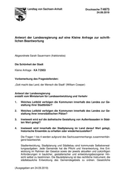 "content": "Landtag von Sachsen-Anhalt Drucksache 7/4973 24.09.2019 Antwort der Landesregierung auf eine Kleine Anfrage zur schrift- lichen Beantwortung Abgeordnete Sarah Sauermann (fraktionslos) Die Schönheit der Stadt Kleine Anfrage - KA 7/2953 Vorbemerkung des Fragestellenden: „Gott macht das Land, der Mensch die Stadt“ (William Cowper) Antwort der Landesregierung erstellt vom Ministerium für Landesentwicklung und Verkehr 1. Welches Leitbild verfolgen die Kommunen innerhalb des Landes zur Ge- staltung ihrer Stadtbilder? 2. Welches Leitbild verfolgen die Kommunen innerhalb des Landes zur Ge- staltung ihrer innerstädtischen Plätze? 3. Inwieweit wird auf die ästhetische Gestaltung von Außenfassaden in Städ- ten Wert gelegt? 4. Inwieweit wird innerhalb der Stadtplanung im Land darauf Wert gelegt, historische Ensemble zu erhalten oder wiederherzustellen? Die Fragen 1 bis 4 werden aufgrund des Sachzusammenhangs zusammenhän- gend beantwortet. Stadtentwicklung, Stadtplanung und Städtebau sind kommunale Selbstverwal- tungsaufgaben. Jede Gemeinde hat die Pflicht und Verantwortung, ihre Ent- wicklung im Rahmen der Gesetze sowie der jeweils aktuellen und zukünftigen Anforderungen in baulicher, gestalterischer und entwicklungsbezogener Hin- sicht selbst zu bestimmen. Die Bauleitplanung ist das rechtliche Instrument, die städtebauliche Entwicklung des Gemeindegebiets zu ordnen. Gesetzliche (Ausgegeben am 24.09.2019)",