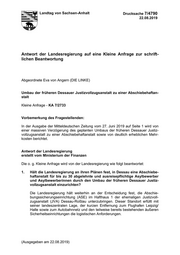 "content": "Landtag von Sachsen-Anhalt Drucksache 7/4790 22.08.2019 Antwort der Landesregierung auf eine Kleine Anfrage zur schrift- lichen Beantwortung Abgeordnete Eva von Angern (DIE LINKE) Umbau der früheren Dessauer Justizvollzugsanstalt zu einer Abschiebehaftan- stalt Kleine Anfrage - KA 7/2733 Vorbemerkung des Fragestellenden: In der Ausgabe der Mitteldeutschen Zeitung vom 27. Juni 2019 auf Seite 1 wird von einer massiven Verzögerung des geplanten Umbaus der früheren Dessauer Justiz- vollzugsanstalt zu einer Abschiebehaftanstalt sowie von deutlich erheblichen Mehr- kosten berichtet. Antwort der Landesregierung erstellt vom Ministerium der Finanzen Die o. g. Kleine Anfrage wird von der Landesregierung wie folgt beantwortet: 1. Hält die Landesregierung an ihren Plänen fest, in Dessau eine Abschiebe- haftanstalt für bis zu 30 abgelehnte und ausreisepflichtige Asylbewerber und Asylbewerberinnen durch den Umbau der früheren Dessauer Justiz- vollzugsanstalt einzurichten? Die Landesregierung hält weiterhin an der Entscheidung fest, die Abschie- bungssicherungseinrichtung (ASE) im Hafthaus 1 der ehemaligen Justizvoll- zugsanstalt (JVA) Dessau-Roßlau unterzubringen. Dieser Standort erfüllt mit seiner landeszentralen Lage, der kurzen Entfernung zum Flughafen Leipzig/ Halle sowie zum Autobahnnetz und den teilweise bereits bestehenden äußeren Sicherheitseinrichtungen die logistischen Anforderungen. (Ausgegeben am 22.08.2019)",