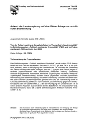 "content": "Landtag von Sachsen-Anhalt Drucksache 7/6428 31.07.2020 Antwort der Landesregierung auf eine Kleine Anfrage zur schrift- lichen Beantwortung Abgeordnete Henriette Quade (DIE LINKE) Von der Polizei registrierte Gewaltstraftaten im Themenfeld „Hasskriminalität“ im Definitionssystem „Politisch motivierter Kriminalität“ (PMK) und im Phäno- menbereich PMK-rechts im Juni 2020 Kleine Anfrage - KA 7/3834 Vorbemerkung der Fragestellenden: Das Definitionssystem „Politisch motivierte Kriminalität“ wurde zuletzt 2016 überar- beitet und zum Teil neu strukturiert. Seit dem 01.01.2017 gilt eine Tat u. a. als poli- tisch motiviert, „wenn in Würdigung der Umstände der Tat und/oder der Einstellung des Täters Anhaltspunkte dafür vorliegen, dass sie (…) gegen eine Person wegen ih- rer/ihres zugeschriebenen oder tatsächlichen politischen Haltung, Einstellung und/oder Engagements, Nationalität, ethnischer Zugehörigkeit, Hautfarbe, Religions- zugehörigkeit, Weltanschauung, sozialen Status, physischen und/oder psychischen Behinderung oder Beeinträchtigung, sexuellen Orientierung und/oder sexuellen Iden- tität oder äußeren Erscheinungsbildes gerichtet sind und die Tathandlung damit im Kausalzusammenhang steht bzw. sich in diesem Zusammenhang gegen eine Institu- tion/Sache oder ein Objekt richtet. (…) Bei der Würdigung der Umstände der Tat ist neben anderen Aspekten auch die Sicht der/des Betroffenen mit einzubeziehen“ (vgl. Bundeskriminalamt, Stand 08.12.2016: Definitionssystem „Politisch motivierte Krimi- nalität“, S. 5). Hinweis: Die Drucksache steht vollständig digital im Internet/Intranet zur Verfügung. Die Anlage ist in Word als Objekt beigefügt und öffnet durch Doppelklick den Acrobat Reader. Bei Bedarf kann Einsichtnahme in der Bibliothek des Landtages von Sachsen-Anhalt er- folgen oder die gedruckte Form abgefordert werden. (Ausgegeben am 03.08.2020)",