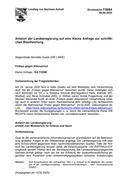 "content": "Landtag von Sachsen-Anhalt Drucksache 7/5984 09.04.2020 Antwort der Landesregierung auf eine Kleine Anfrage zur schriftli- chen Beantwortung Abgeordnete Henriette Quade (DIE LINKE) Fridays gegen Altersarmut Kleine Anfrage - KA 7/3586 Vorbemerkung der Fragestellenden: Am 24. Januar 2020 fand in Halle (Saale) auf dem Marktplatz eine Versammlung statt, die als „Fridays gegen Altersarmut“ beworben wurde. Daran beteiligten sich nach Berichten vor Ort u. a. Donatus Schmidt (Montagsdemo Halle, ehemals AfD- Stadtrat) und René Schnabel (AfD). In Köthen waren André Poggenburg und der Neonazi Alexander Kurth an einer „Fridays gegen Altersarmut“-Versammlung betei- ligt, auch in anderen Orten waren Rechtsextreme aktiv beteiligt („So rechtsextrem waren die Mahnwachen Friday gegen Altersarmut“, 24.02.2020, volksverpetzer.de, Link: https://www.volksverpetzer.de/recherche-afd/so-rechts-fridays-altersarmut/) Bundesweit wurden die Kundgebungen u. a. durch die neonazistische Partei DIE RECHTE sowie rechtsextreme Medien wie „Journalistenwatch“ beworben. Antwort der Landesregierung erstellt vom Ministerium für Inneres und Sport Vorbemerkung: Zwar ist der parlamentarische Informationsanspruch grundsätzlich auf die Beantwor- tung gestellter Fragen in der Öffentlichkeit angelegt. Die Landesregierung trifft aber eine Schutz-pflicht gegenüber ihren nachrichtendienstlichen Quellen. Teile der Ant- wort der Landesregierung müssen daher als Verschlusssache „VS-VERTRAULICH“ eingestuft werden. Hierbei wird der Rechtsprechung des Landesverfassungsgerichts Sachsen-Anhalt gefolgt, nach der bei der Erfüllung der Auskunftsverpflichtung ge- genüber dem Parlament unter Geheimhaltungsaspekten wirksame Vorkehrungen Hinweis: Eine Einsichtnahme des vertraulichen Teils o. g. Antwort ist für Mitglieder des Landta- ges in der Landtagsverwaltung - Akteneinsichtnahmeraum - nach Terminabsprache möglich. (Ausgegeben am 14.04.2020)",