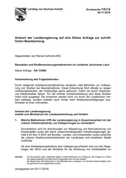 "content": "Landtag von Sachsen-Anhalt Drucksache 7/5174 04.11.2019 Antwort der Landesregierung auf eine Kleine Anfrage zur schrift- lichen Beantwortung Abgeordneter Jan Wenzel Schmidt (AfD) Baustellen und Straßensanierungsmaßnahmen im Landkreis Jerichower Land Kleine Anfrage - KA 7/3009 Vorbemerkung des Fragestellenden: Durch steigende Arbeitsschutzmaßnahmen tendieren viele Behörden zur Vollsper- rung von Straßen bei Baumaßnahmen. Diese Entwicklung führt oftmals zu langen Umleitungsstrecken, die Ortskundige gerne abkürzen, indem sie durch Anwohner- und Nebenstraßen fahren. Für die erhöhte Verkehrsbelastung sind diese Straßen meist nicht ausgelegt. Die Anwohner werden nicht nur durch den zusätzlichen Ver- kehr belästigt, sondern erleiden auch immer mehr Straßenbeschädigungen bzw. Schäden an ihren Immobilien. Antwort der Landesregierung erstellt vom Ministerium für Landesentwicklung und Verkehr 1. Welche Maßnahmen trifft die Landesregierung in Zusammenarbeit mit der unteren Verkehrsbehörde, um Vollsperrungen zu vermeiden? Grundsätzlich sind für Anordnungen zur Absperrung und Kennzeichnung von Arbeitsstellen sowie alle damit zusammenhängenden Verkehrsregelungen ge- mäß § 45 Abs. 6 StVO auf Bundes-, Landes- und Kreisstraßen sowie außerorts die unteren Straßenverkehrsbehörden der Landkreise und kreisfreien Städte zuständig. Ob eine Straßenbaumaßnahme eine Vollsperrung erfordert wird von den Rege- lungen der StVO und der Richtlinie für die Sicherung von Arbeitsstellen an Hinweis: Die Drucksache steht vollständig digital im Internet/Intranet zur Verfügung. Die Anlage ist in Word als Objekt beigefügt und öffnet durch Doppelklick den Acrobat Reader. Bei Bedarf kann Einsichtnahme in der Bibliothek des Landtages von Sachsen-Anhalt erfolgen oder die gedruckte Form abgefordert werden. (Ausgegeben am 05.11.2019)",
