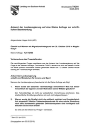 "content": "Landtag von Sachsen-Anhalt Drucksache 7/4291 03.05.2019 Antwort der Landesregierung auf eine Kleine Anfrage zur schrift- lichen Beantwortung Abgeordneter Hagen Kohl (AfD) Überfall auf Männer mit Migrationshintergrund am 28. Oktober 2018 in Magde- burg II Kleine Anfrage - KA 7/2485 Vorbemerkung des Fragestellenden: Die nachfolgenden Fragen resultieren aus der Antwort der Landesregierung auf die Frage 4 der Kleinen Anfrage, Drucksache 7/4043, wonach es sich bei diesem Vorfall um keine politisch motivierte Straftat gehandelt haben soll. Zu dieser Straftat wurde bislang ein Tatverdächtiger ermittelt. Antwort der Landesregierung erstellt vom Ministerium für Inneres und Sport Namens der Landesregierung beantworte ich die Kleine Anfrage wie folgt: 1. Wann wurde der bekannte Tatverdächtige vernommen? Was hat dieser hinsichtlich der eigenen und der Motivation seiner Mittäter geäußert? Der Tatverdächtige ist nicht zur polizeilichen Vernehmung erschienen. Das 1 strafrechtliche Ermittlungsverfahren ist noch nicht abgeschlossen. 2. Warum wurde die Straftat nicht als politisch motiviert und fremdenfeind- lich eingestuft? Welche Tatbestandsmerkmale für eine solche Einstufung nach dem bundesweit geltenden Definitionssystem sind vorliegend aus welchem Grund nicht erfüllt? Es wird auf die Antwort auf Frage 1 verwiesen. 1 Stand 23. April 2019. (Ausgegeben am 03.05.2019)",