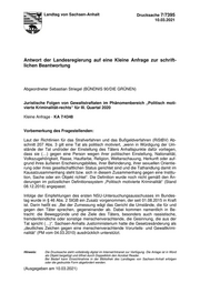 "content": "Landtag von Sachsen-Anhalt Drucksache 7/7395 10.03.2021 Antwort der Landesregierung auf eine Kleine Anfrage zur schrift- lichen Beantwortung Abgeordneter Sebastian Striegel (BÜNDNIS 90/DIE GRÜNEN) Juristische Folgen von Gewaltstraftaten im Phänomenbereich „Politisch moti- vierte Kriminalität-rechts“ für III. Quartal 2020 Kleine Anfrage - KA 7/4348 Vorbemerkung des Fragestellenden: Laut der Richtlinien für das Strafverfahren und das Bußgeldverfahren (RiStBV) Ab- schnitt 207 Abs. 3 gilt eine Tat als politisch motiviert, „wenn in Würdigung der Um- stände der Tat und/oder der Einstellung des Täters Anhaltspunkte dafür vorliegen, dass sie (…) gegen eine Person wegen ihrer politischen Einstellung, Nationalität, Volkszugehörigkeit, Rasse, Hautfarbe, Religion, Weltanschauung, Herkunft oder auf- grund ihres äußeren Erscheinungsbildes, ihrer Behinderung, ihrer sexuellen Orientie- rung oder ihres gesellschaftlichen Status gerichtet sind und die Tathandlung damit im Kausalzusammenhang steht bzw. sich in diesem Zusammenhang gegen eine Institu- tion, Sache oder ein Objekt richtet“. Die Definition wurde noch nicht gemäß den Än- derungen im polizeilichen Definitionssystem „Politisch motivierte Kriminalität“ (Stand 08.12.2016) angepasst. Infolge der Empfehlungen des ersten NSU-Untersuchungsausschusses im Bundes- tag wurde in § 46 Abs. 2 StGB ein Zusatz vorgenommen, der seit 01.08.2015 in Kraft ist. Darin heißt es: „Bei der Zumessung wägt das Gericht die Umstände, die für und gegen den Täter sprechen, gegeneinander ab. Dabei kommen namentlich in Be- tracht: die Beweggründe und die Ziele des Täters, besonders auch rassistische, fremdenfeindliche oder sonstige menschenverachtende, die Gesinnung, die aus der Tat spricht (…)“. Sachsen-Anhalts Justizministerium hatte die Gesetzesänderung als „deutliches Zeichen gegen eine menschenverachtende Vorurteils- und Gewaltkrimi- nalität“ (PM vom 04.03.2010) ausdrücklich unterstützt. Hinweis: Die Drucksache steht vollständig digital im Internet/Intranet zur Verfügung. Die Anlage ist in Word als Objekt beigefügt und öffnet durch Doppelklick den Acrobat Reader. Bei Bedarf kann Einsichtnahme in der Bibliothek des Landtages von Sachsen-Anhalt erfolgen oder die gedruckte Form abgefordert werden. (Ausgegeben am 10.03.2021)",