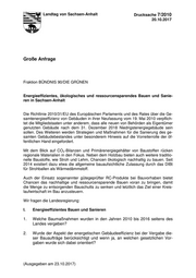 "content": "Landtag von Sachsen-Anhalt Drucksache 7/2010 20.10.2017 Große Anfrage Fraktion BÜNDNIS 90/DIE GRÜNEN Energieeffizientes, ökologisches und ressourcensparendes Bauen und Sanie- ren in Sachsen-Anhalt Die Richtlinie 2010/31/EU des Europäischen Parlaments und des Rates über die Ge- samtenergieeffizienz von Gebäuden in ihrer Neufassung vom 19. Mai 2010 verpflich- tet die Mitgliedstaaten unter anderem, dass alle neuen von Behörden als Eigentümer genutzten Gebäude nach dem 31. Dezember 2018 Niedrigstenergiegebäude sein sollen. Des Weiteren werden Strategien und Maßnahmen für die Sanierung des ge- samten Gebäudebestandes unter besonderem Hinweis auf die Vorreiterrolle der öf- fentlichen Hand eingefordert. Mit dem Blick auf CO₂-Bilanzen und Primärenergiegehälter von Baustoffen rücken regionale Materialien in den Fokus. Neben dem Holzbau bieten auch weitere traditio- nelle Baustoffe, wie Stroh und Lehm, Chancen ökologisch nachhaltig zu bauen. Seit 2014 existiert dazu etwa die allgemeine bauaufsichtliche Zulassung durch das DIBt für Strohballen als Wärmedämmstoff. Auch der Einsatz sogenannter gütegeprüfter RC-Produkte bei Bauvorhaben bietet Chancen das nachhaltige und ressourcensparende Bauen voran zu bringen, damit die Menge zu entsorgenden Bauschutts zu senken und letztlich das Ziel einer Kreis- laufwirtschaft im Bau anzusteuern. Wir fragen die Landesregierung: I. Energieeffizientes Bauen und Sanieren 1. Welche Baumaßnahmen wurden in den Jahren 2010 bis 2016 seitens des Landes vergeben? 2. Wurde der Aspekt der energetischen Gebäudeeffizienz bei der Vergabe die- ser Bauaufträge berücksichtigt und wenn ja, an welchen gesetzlichen Vor- gaben wurde sich dabei orientiert? (Ausgegeben am 23.10.2017)",